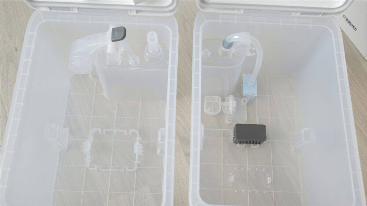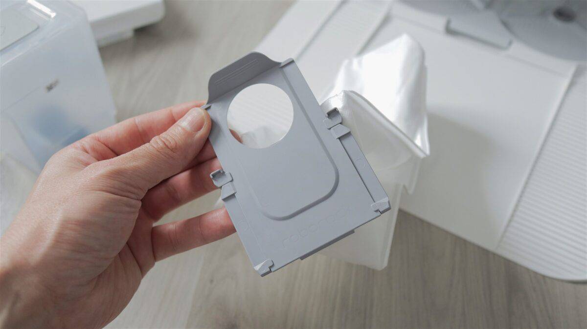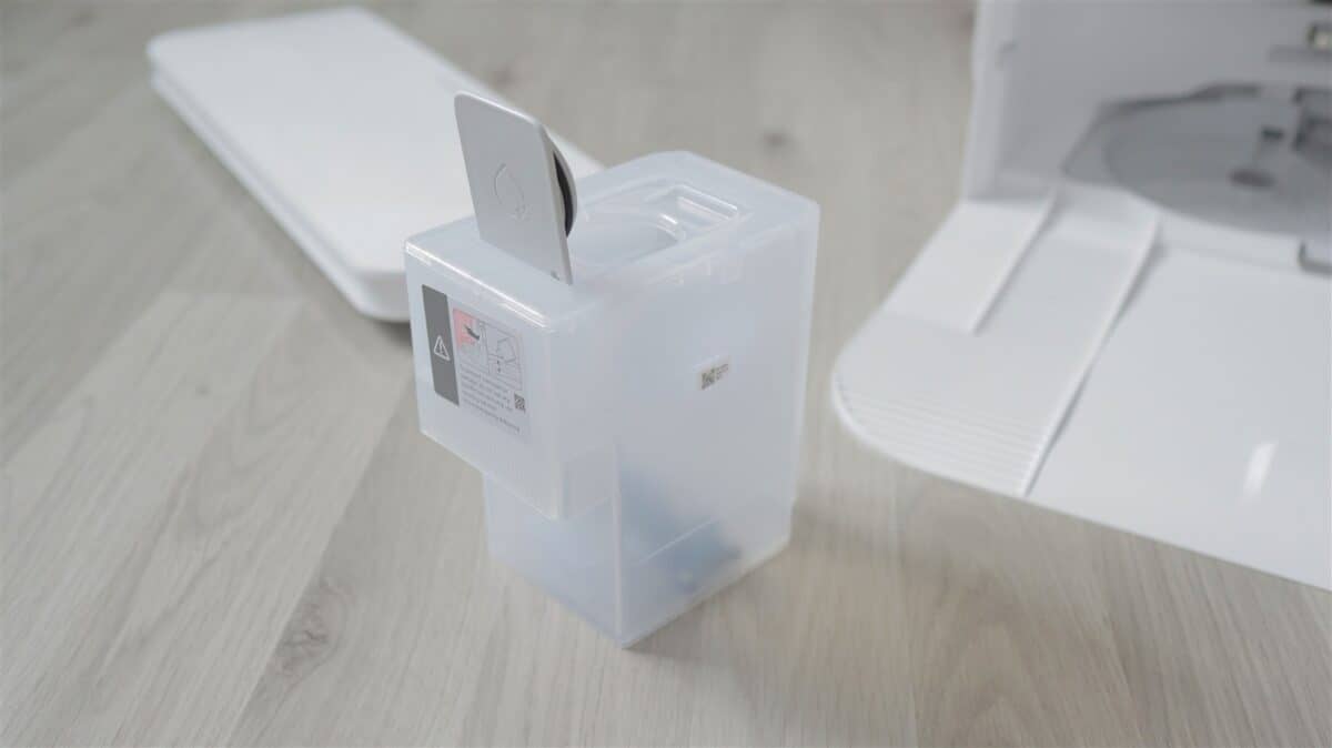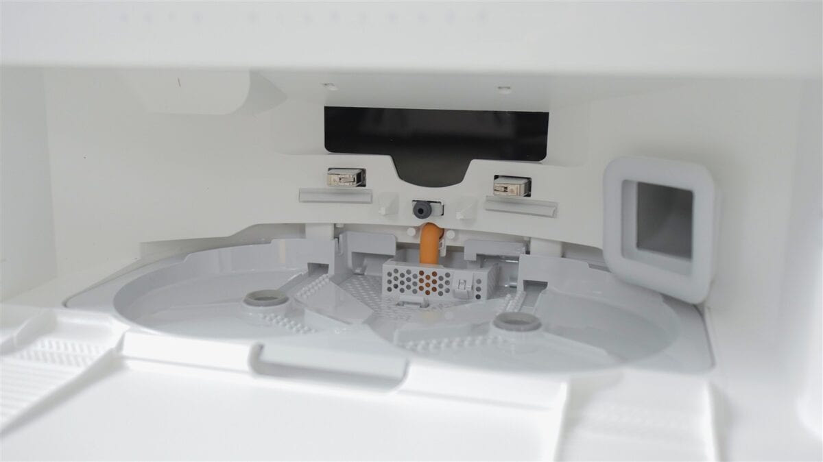 În fine, stația de andocare mi se pare chiar compactă raportat la tot ce integrează. Sus avem două rezervoare pentru apă (curată și murdară), care se pot scoate facil de la locul lor și umple, respectiv goli, la fel de ușor. Pe partea frontală apare un capac care și el se detașează rapid, în spatele căruia este sacul de praf și rezervorul pentru detergent lichid pentru funcția de spălare a podelelor.