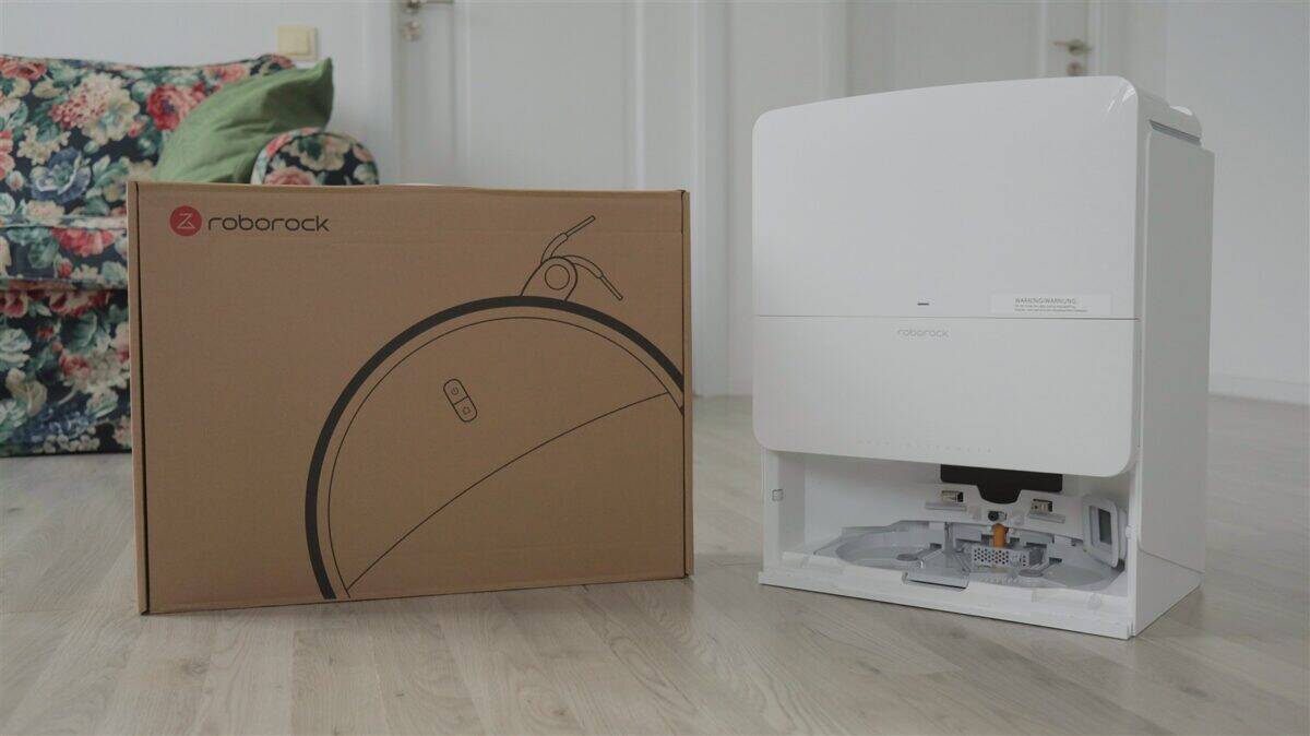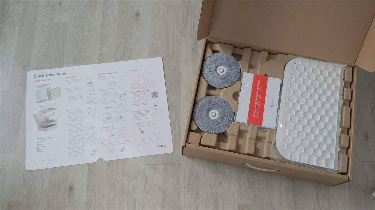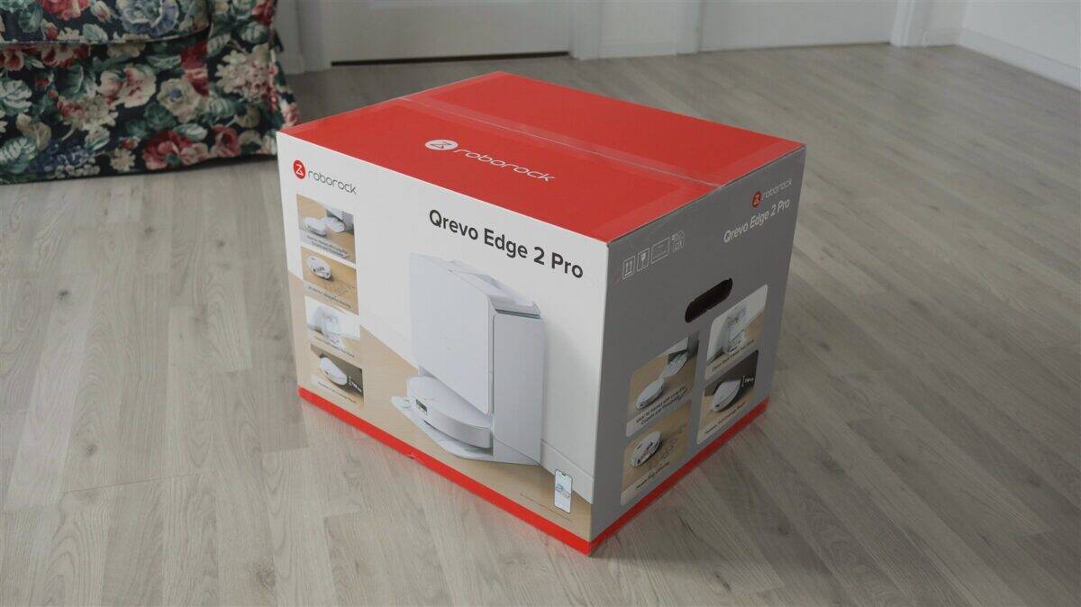 Am primit pentru test Roborock Qrevo Edge 2 Pro în cutia de retail. Sunt, de fapt, două cutii: una exterioară care o protejează foarte bine pe cea secundară, pe care apar imagini și cele mai importante caracteristici ale produsului. Înăuntru, robotul de aspirare este fixat și protejat într-o altă cutie, în timp ce stația de andocare este acoperită și ea de o folie de protecție. Mai mult, atât pe roboto, cât și pe stație, sunt aplicate din fabrică multiple folii care să reducă șansele de a zgâria ceva în timpul procesului de desfacere din cutie. Aparte de robot și stație, mai avem separat cele două mopuri, elementul pe care trebuie să-l atașezi stației pentru ca robotul să poată „urca” ușor către locul său și o serie de pliante, manual de utilizare și certificat de garanție.