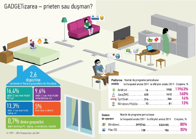 Cei de la Kaspersky Lab au realizat un studiu global cu privire la utilizarea de gadget-uri în gospodării, studiu care a cuprins şi România. Conform acestui studiu, o familie obişnuită din România deţine, în medie, 2,6 dispozitive cu acces la Internet şi capabile să stocheze o cantitate ridicată de date. Primul loc în acest studiu este deţinut de Arabia Saudită cu o medie de 4,3 gadget-uri per gospodărie, în timp ce România a ieşit ultima.