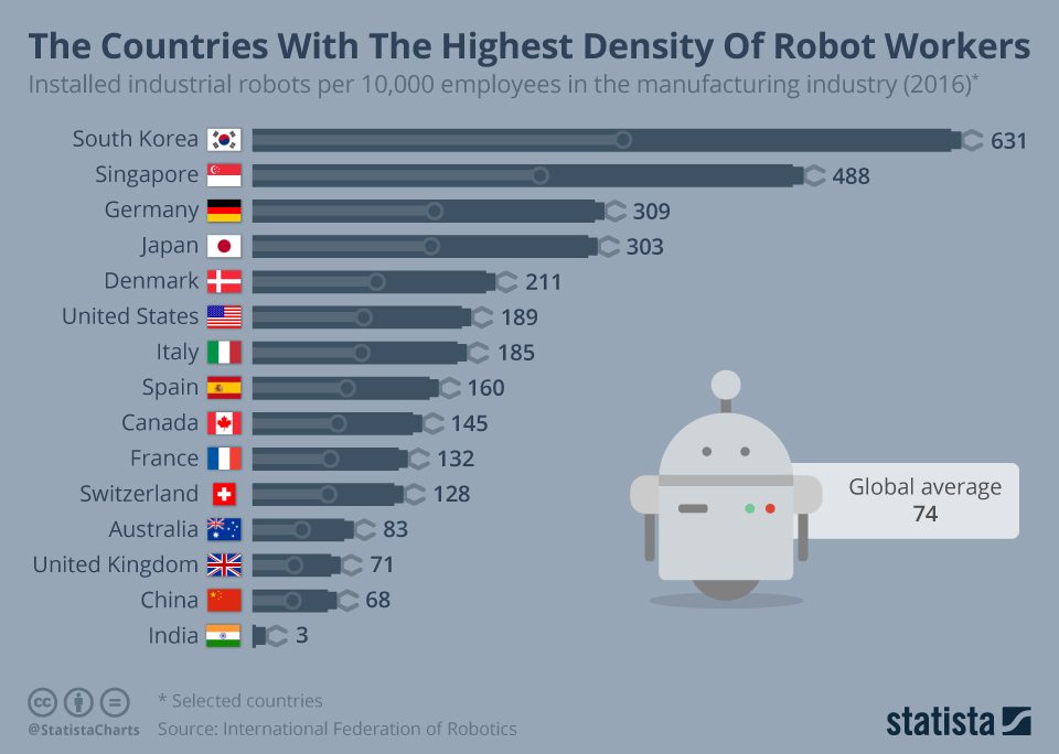 Cei mai mulţi roboţi industriali se găsescă în Coreea de Sud (631 la 10.000 de angajaţi), Singapore (488 la 10.000 de angajaţi) şi Germania (309 la 10.000 de angajaţi) – datele sunt valabile pentru anul 2016. Ca membră a Uniunii Europene, Germania a avut în 2017 cea mai scăzută rată a şomajului din istorie, chiar dacă este una dintre cele mai robotizate ţări din lume.