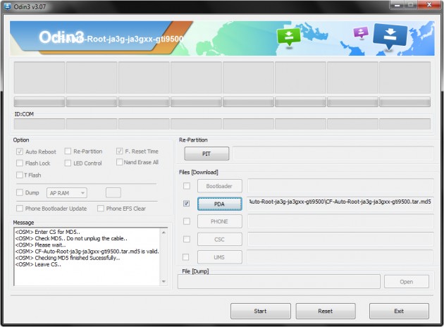 Dacă Odin3 va afișa mesajul PASS! iar telefonul tău rămâne în Download Mode, va trebui să-l introduci în Recovery Mode manual. Pentru acest lucru va trebui să scoți bateria și să o introduci înapoi (sau să ții apăsat lung pe butonul Power dacă acumulatorul nu se poate scoate), și să apeși Volum Plus + buton Home + buton Power, pentru tablete Volum Plus + buton Power și procesul va continua normal.