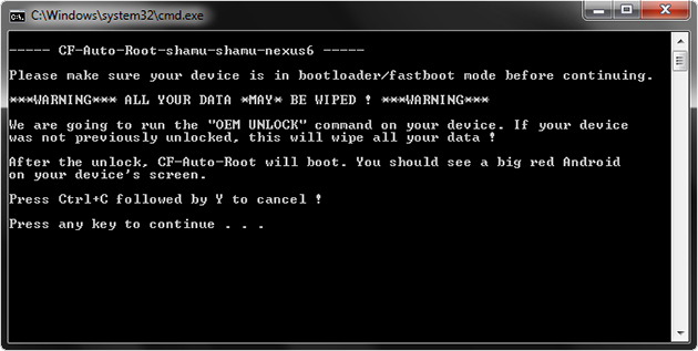 5. Deschide folderul CF Auto Root descărcat mai sus în funcție de device, și fă dublu click pe fișierul root-windows.bat. Se va deschide o fereastră ca cea dinainte în care ești avertizat că toate datele tale de pe telefon se vor pierde dacă nu ai făcut deja unlock la bootloader. Confirmă prin apăsarea oricărei taste. Dacă bootloaderul este blocat, vei vedea logoul Android roșu pe ecranul telefonului timp de aproximativ un minut. Dacă bootloader este deblocat, va trece direct la obținerea accesului root.