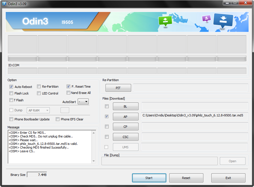 4. Apasă pe butonul AP din Odin și selectează fișierul philz_touch_6.12.8-i9500.tar.md5 astfel încât aplicația să arate ca în imaginea de mai jos. NU MODIFICA ALTCEVA ÎN ODIN!