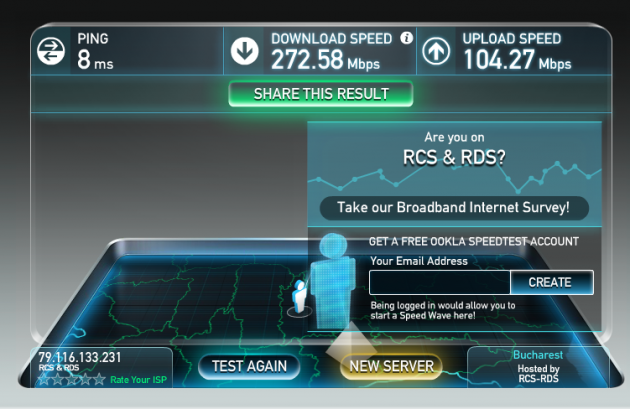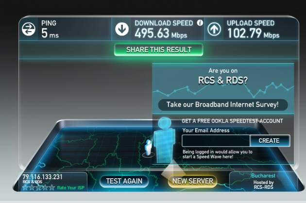 Pe fir – 495.63 Mbps la download și 102.79 Mbps la upload;