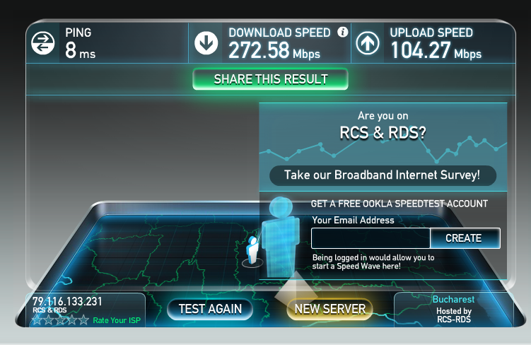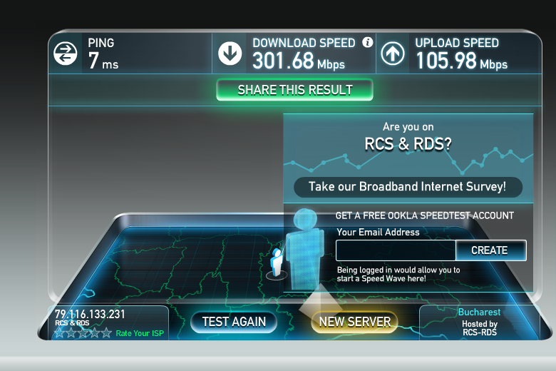 Prin Wi-Fi contează ce device folosești: smartphone, tabletă, laptop, desktop PC și standardul Wi-Fi încorporat. Ar fi ideal pe un desktop PC sau laptop să ai un SSD și Wi-Fi ac sau adaptor dedicat. Pe ASUS G771 s-a oprit la un maxim de 301.68 Mbps la download și 105.98 Mbps la upload și asta cu ajutorul adaptorului ASUS AC1200 pe USB 3.0, pe Wi-Fi ac a atins 269.11 Mbps la download și 106.82 Mbps la upload.