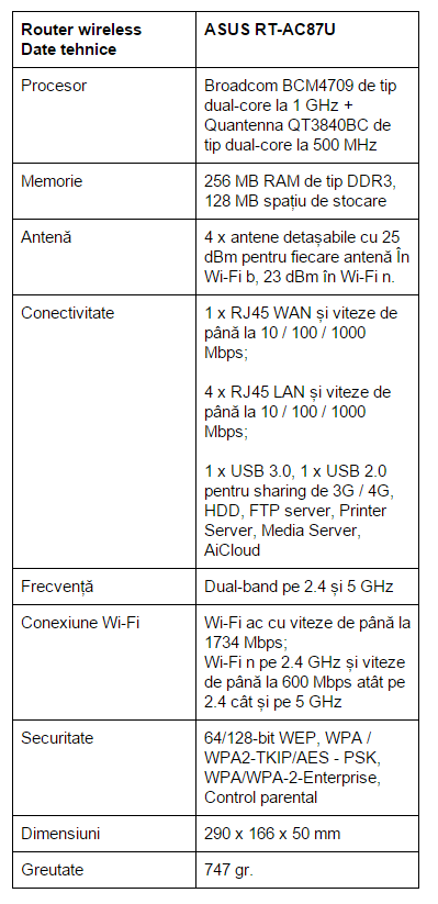 Specificații detaliate pentru router-ul Wi-Fi ASUS RT-AC87U: