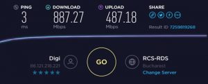 L-am testat pe mai multe laptopuri și telefoane mobile cu SpeedTest, iar rezultatele le vedeți în capturile de ecran. Folosesc o conexiune de internet cu viteze de până la 1000 Mbps în download și 500 Mbps în upload.