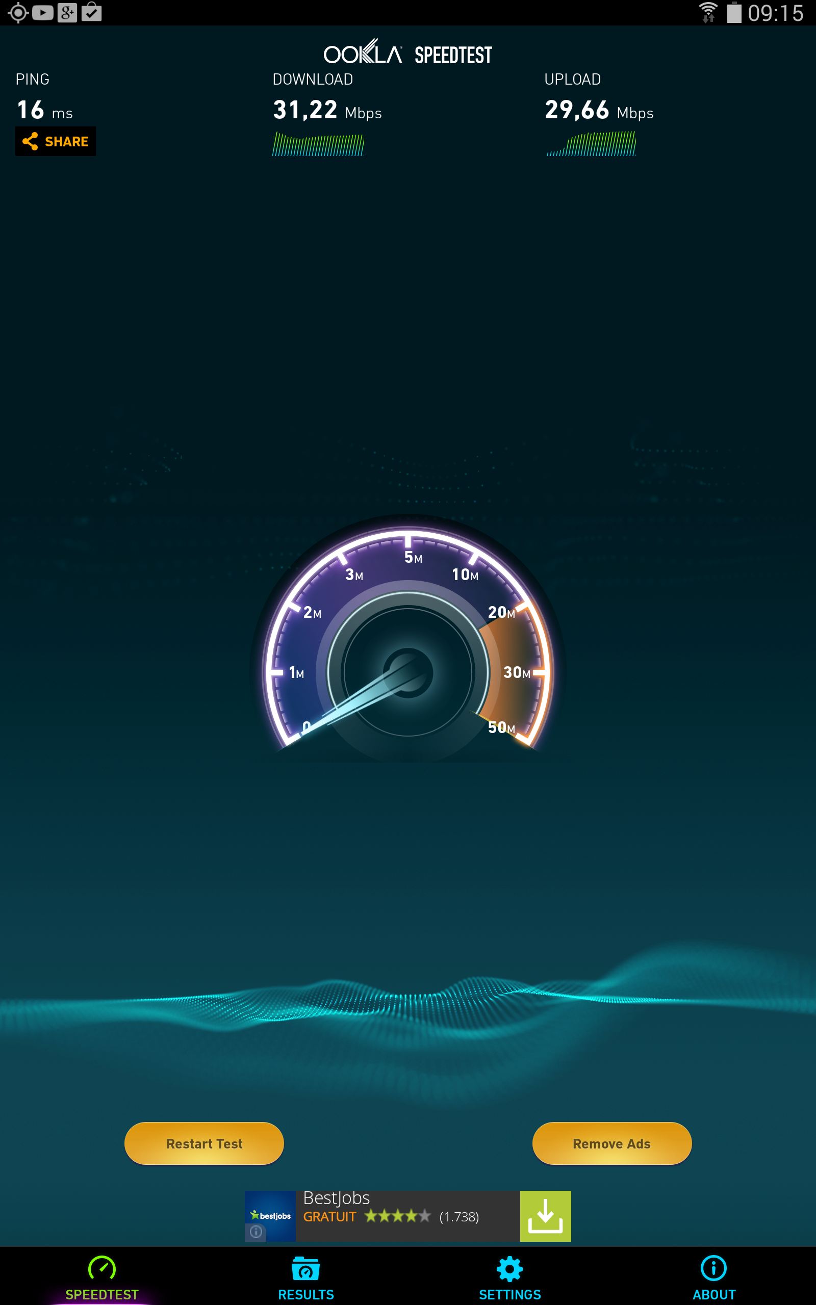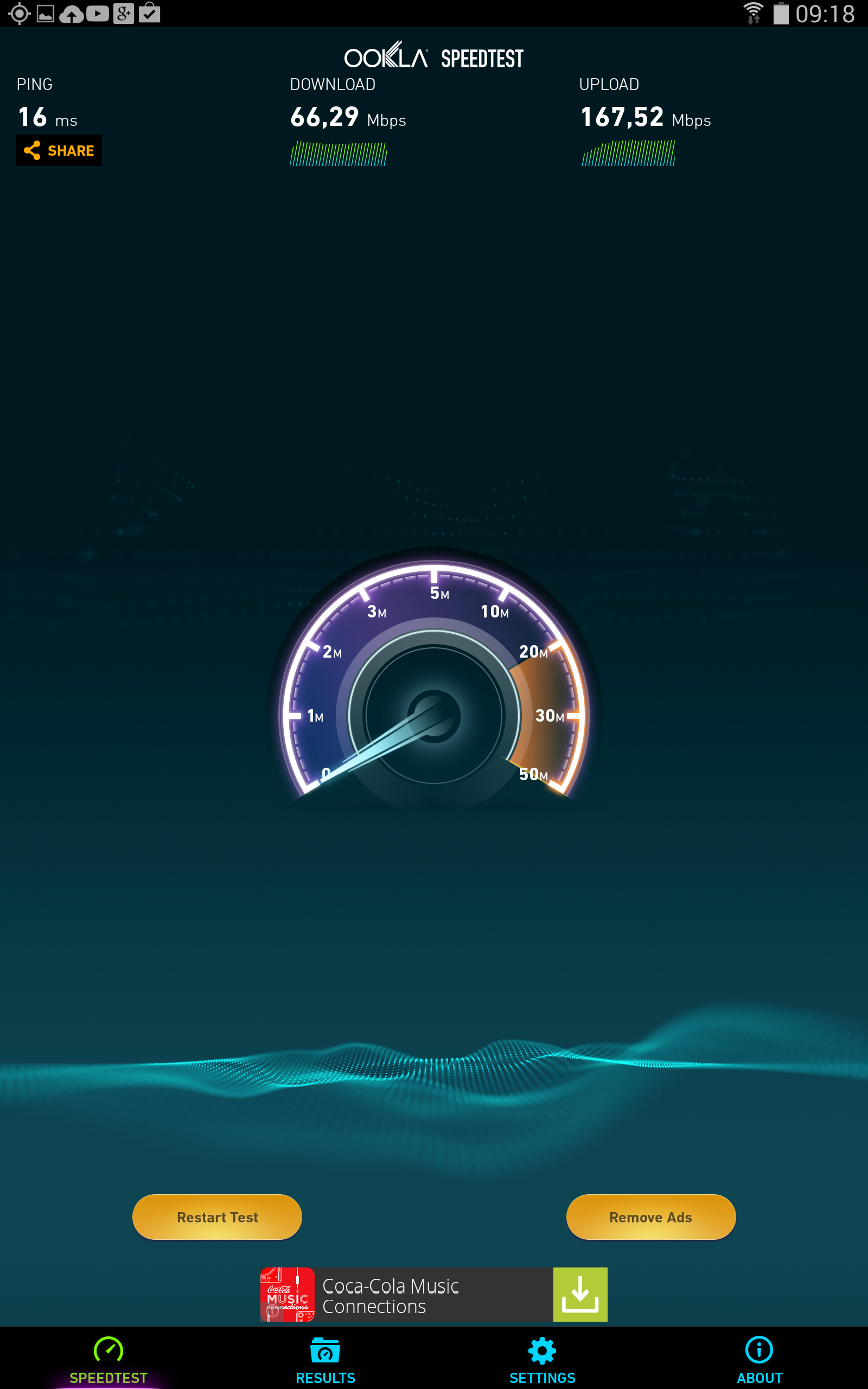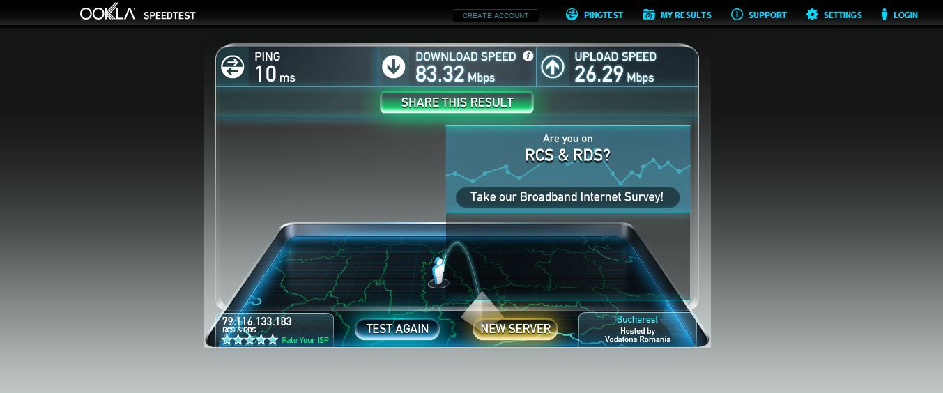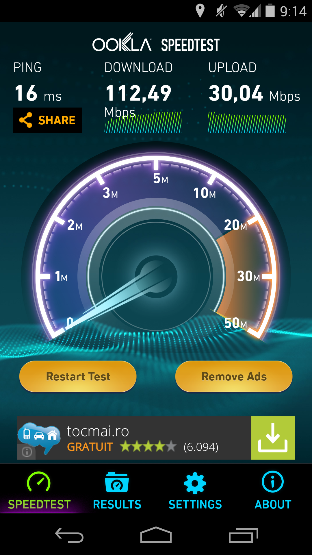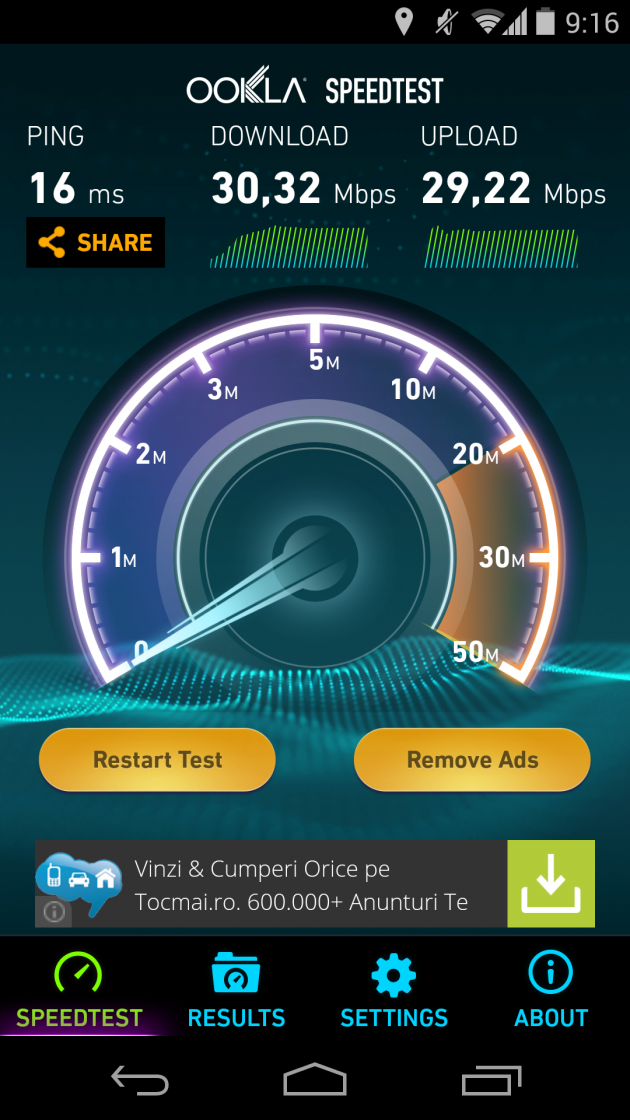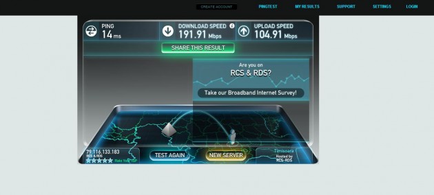 Am folosit cea mai uzuală aplicație de benchmark la momentul actual. Rezultatele obținute variază în funcție de accesarea internetului oferit de router cu ajutorul unui adaptor Wi-Fi ac, pe 5 GHz atinge valori aproape duble față de 2.4 GHz. Asta-i vizibil și când te conectezi cu ajutorul unui telefon mobil sau cu o tabletă dual-band.
