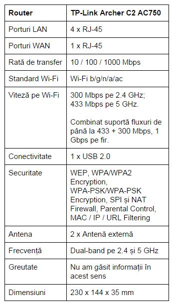 Câteva din specificațiile lui TP-Link Archer C2 AC750: