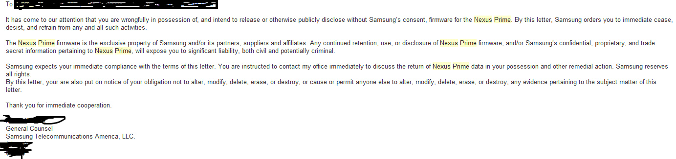 Pe lângă iPhone 5 în 2011 a mai fost un smartphone ce a suscitat enorm de multe discuții. Este vorba de Nexus Prime și urmașul lui Nexus One și Nexus S (am pus aici o comparație între datele tehnice ce le animă). Se pare că un model de Nexus Prime a intrat în posesia unui tip ce dorește să ofere informațiile mai departe. Samsung s-a sesizat și a trimis o solicitare pe care o vedeți mai jos în care se recunoaște că telefonul în cauză aparține Samsung și în cazul în care nu-l va înapoia se va ajunge la tribunal.