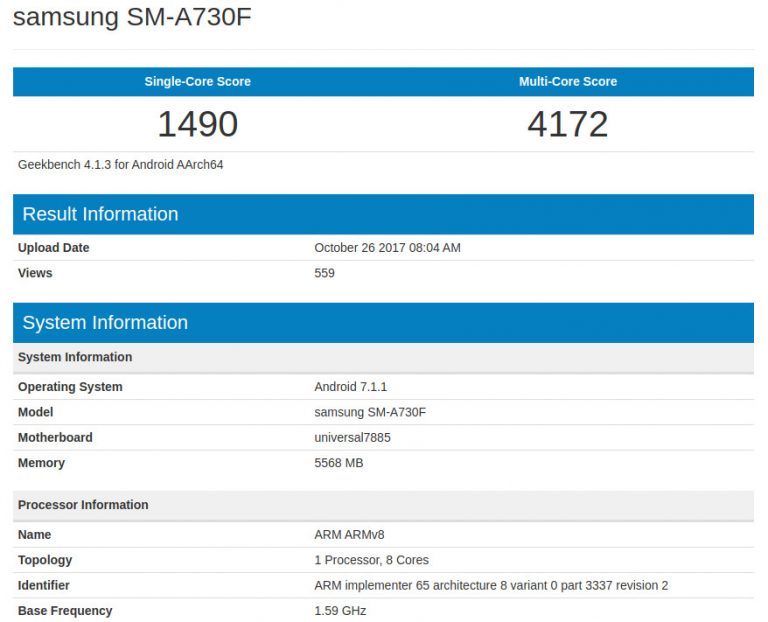 În cunoscutul test de benchmark Geekbench a apărut de curând un misterios smartphone Samsung SM-A730x. Se pare că acesta ar fi nimeni altul decât Samsung Galaxy A7 (2018), device care ar urma să fie anunţat oficial undeva la începutul anului viitor.