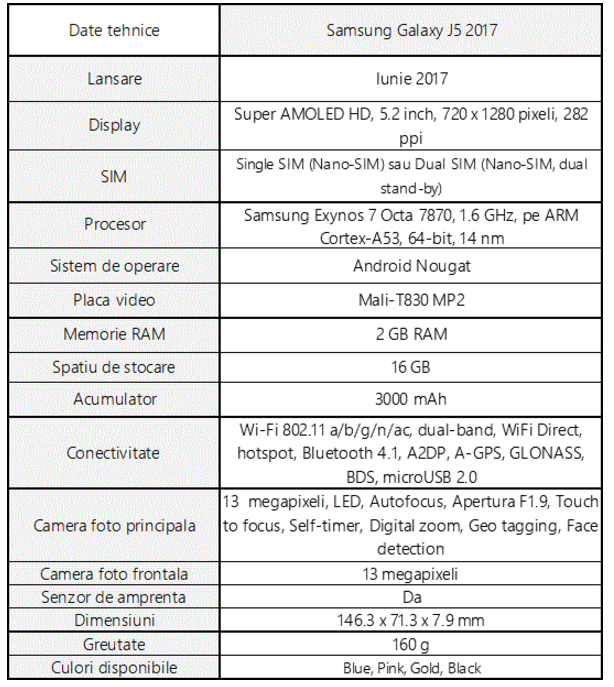 Este clar ca modelul Galaxy J5 vine in 2017 cu un design ceva mai atragator si mai solid, beneficiaza de un senzor de amprente interesant, dar si de un procesor mult mai eficient din punct de vedere energetic, detaliu care creste durata de functionare a bateriei sale. Il puteti achizitiona in functie de sursa pentru sume cuprinse intre 1000 si 1100 de lei. Probabil in timp, la fel ca si in anii precedenti, pretul sau va cobori sub bariera celor 1000 de lei. Haideti insa sa vedem ce specificatii aduce pentru acesti bani.