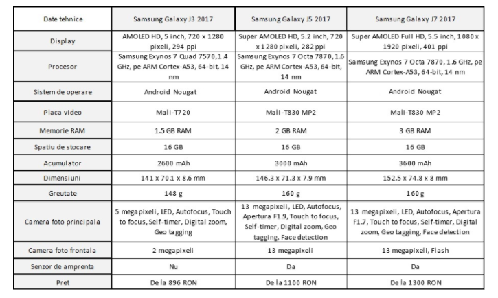 Fara indoiala, Samsung Galaxy J7 este modelul mai puternic al gamei, dar automat si modelul mai scump. Diferenta de pret in momentul lansarii in Romania nu pare sa fie una foarte mare, dar cu timpul, aceasta bariera se va rupe si la fel ca in anii trecuti, Samsung Galaxy J5 va avea un pret sub 1000 de lei. Avantajul achizitionarii modelului mediu al seriei este legat insa de faptul ca telefonul vine cu acelasi tip de procesor proprietar, Exynos 7870, ceea ce inseamna ca modelul Galaxy J5 2017 poate gestiona la fel de eficient bateria sa de 3000 de miliamperi, dar si sa execute rapid sarcinile date de utilizator.