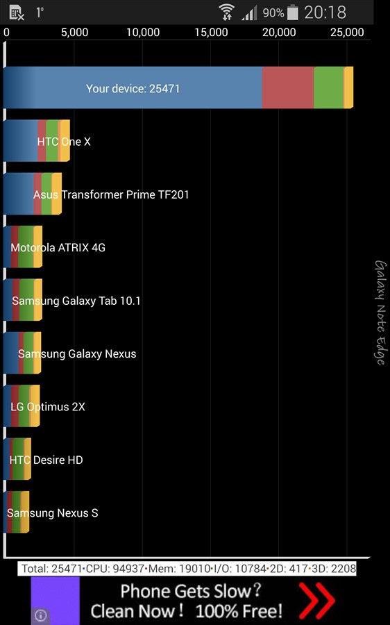 Top of de top, pe sfârșit de 2014 și abia procesorul octa-core Snapdragon 810 se situează peste Snapdragon 805 și al său Adreno 420 + 3 GB RAM, 32 GB spațiu de stocare + slot pentru microSD de până la 128 GB. Acum cred că este de la sine înțeles. Performanțele obținute de acest ansamblu hardware sunt excelente și nicio aplicație sau joc din Google Play nu-i face probleme și aș face pariu că nicio altă aplicație din marketul Android ce va fi anunțată în 2015 nu va pune Note Edge în funcțiune la sarcina sa maximă.