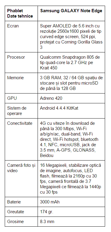 Încep cu datele hardware complete pentru Samsung GALAXY Note Edge:
