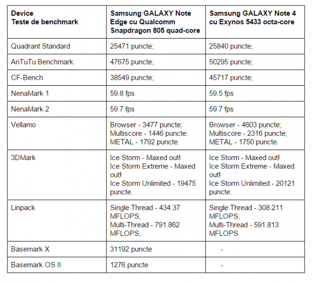 Mai este un aspect interesant. Am testat GALAXY Note 4 cu procesor Exynos octa-core pe arhitectură big.LITTLE, iar multe persoane mi-au cerut să văd cum se descurcă Note 4 cu Qualcomm Snapdragon 805 quad-core, uite că prin intermediul lui GALAXY Note Edge pot face un fel de comparație, iar în secțiunea performanță pe testele de benchmark aveți mai multe detalii.