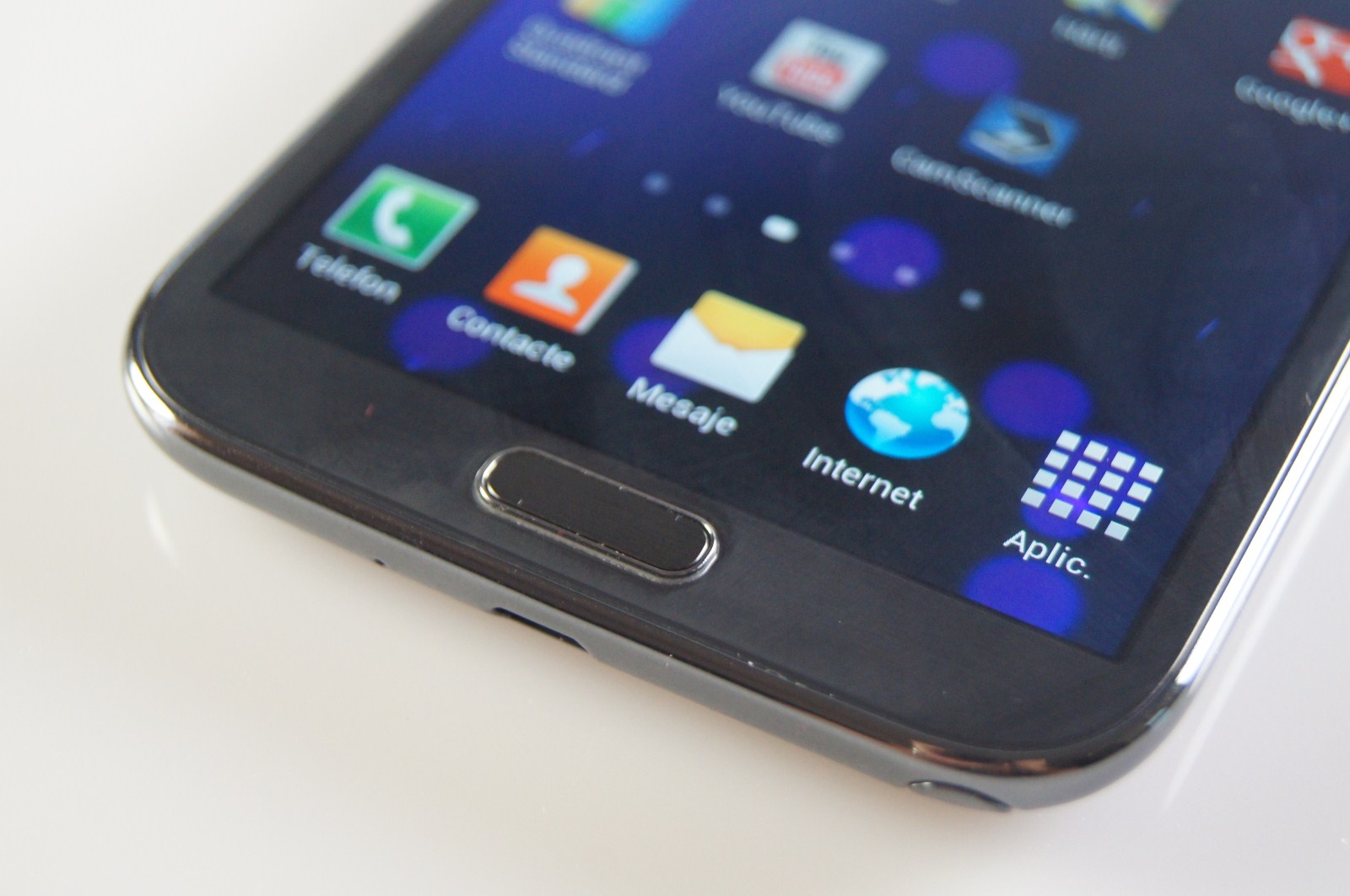 La baza ecranului se află un buton de Home clasic / fizic și două taste capacitive sau senzitive cu rol de Back și Mai multe detalii – o denumire dată de mine în mod ad-hoc. Mi-ar fi plăcut să le integreze în display, butoane touch la Samsung Galaxy Nexus sau ASUS Padfone, dar au optat pentru altă soluție. Sunt și persoane care preferă această soluție, oarecum clasică. Butonul mare de Home dacă este apăsat mai multe pe dreapta duce către aplicațiile ascunse în fundal și le puteți închide sau accesa direct, ca un fel de scurtătură.