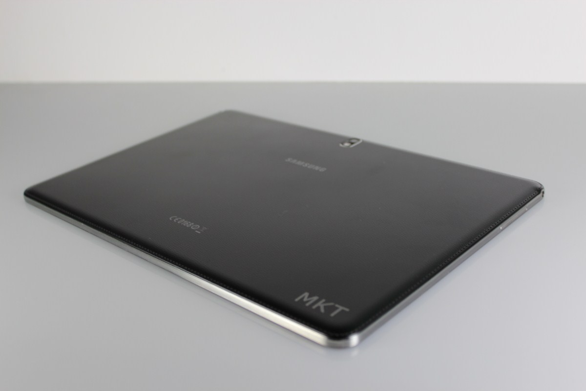 Samsung GALAXY Note Pro 12.2 = Samsung GALAXY Note 3 ce crește în diagonală de la 5.7 inch la 12.2 inch. Spatele tabletei este fabricat dintr-un plastic ce imită pielea cu acea cusătură falsă pe margini. Am apreciat partea de grip, plasticul mat și textură destul de ok. Marginile lui Note PRO 12.2 dau impresia că ar fi fabricate din metal, dar de fapt s-a ales aceeași soluție ca și GALAXY S5, Note 3 etc.