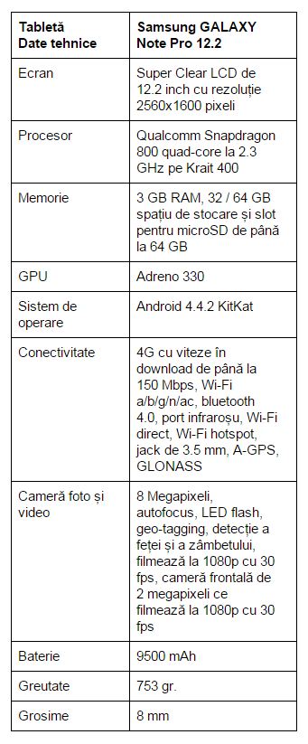Specificații detaliate pentru Samsung GALAXY Note PRO 12.2:
