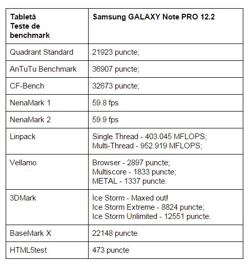 A trecut și prin câteva teste de benchmark, iar rezultatele obținute le-am centralizat în tabel: