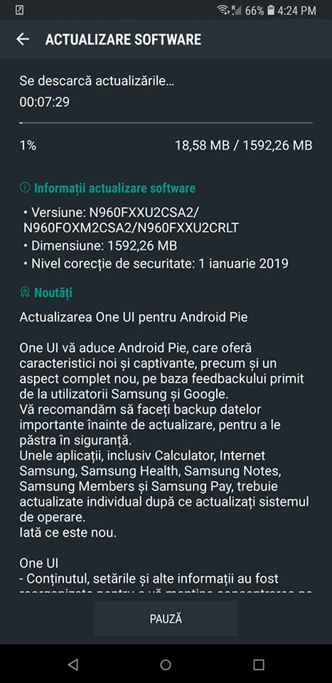 Unul dintre cele mai puternice telefoane inteligente din piaţă a început să primească actualizarea prin zona arabă, mai mulţi utilizatori din Emiratele Arabe Unite confirmând deja update-ul. Acesta are o dimensiune de aproximativ 1.6 GB, vine cu patch-ul de securitate ianuarie 2019 şi este cunoscut ca versiune software N960FOXM2CSA2.