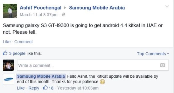 Samsung Mobile Arabia a confirmat pe pagina sa de Facebook faptul că la sfârşitul lunii martie smartphone-urile Samsung Galaxy S3 vor primi update-ul oficial pentru Android 4.4.2 KitKat. Desigur, această afirmaţie este valabilă pentru Emiratele Arabe Unite, dar acest lucru ne dă mari speranţe că cel târziu în luna aprilie vom avea disponibil şi în România update-ul pentru ultima versiune de Android pe Galaxy S3.