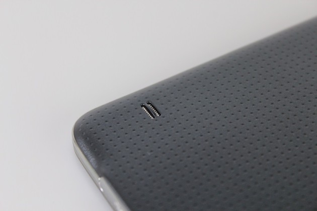 Capacul spate are un model plăcut, cel puțin în varianta pe negru. Este mat și dă un grip excelent. Nu ai impresia că telefonul ți-ar scăpa din mână, deloc. Camera de 16 Megapixeli se profilează dincolo de profilul carcasei și o husă este recomandată pentru a păstra inelul argintiu în bună stare, spre a nu zgâria senzorul. Sub camera de 16 Megapixeli se află senzorul ce măsoară pulsul și LED-ul flash. Sigla Samsung a fost poziționată exact sub camera și LED flash. Speaker-ul pentru sunet este dus spre bază.