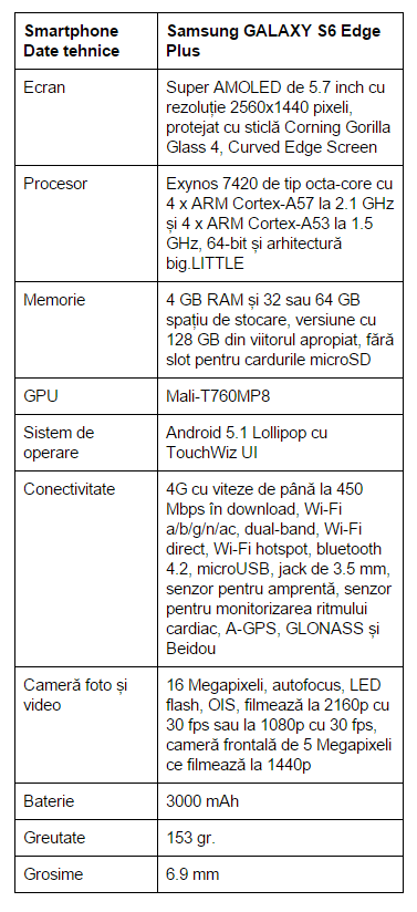 Samsung GALAXY S6 Edge Plus = Samsung GALAXY S6 Edge ce trece de la un display de 5.1 inch la unul de 5.7 inch. Are sticlă pe față și spate, carcasă metalică, ecran ce se întinde în ambele laturi, partea spate în funcție de reflexiile avute aduce un spectru de nuanțe (negru, albastru marin închis, albastru marin ușor mai deschis etc). Atrage atenția prin display-ul său și lasă impresia de terminal premium construit cu materiale de foarte bună calitate, dar și cu atenție maximă la detalii.