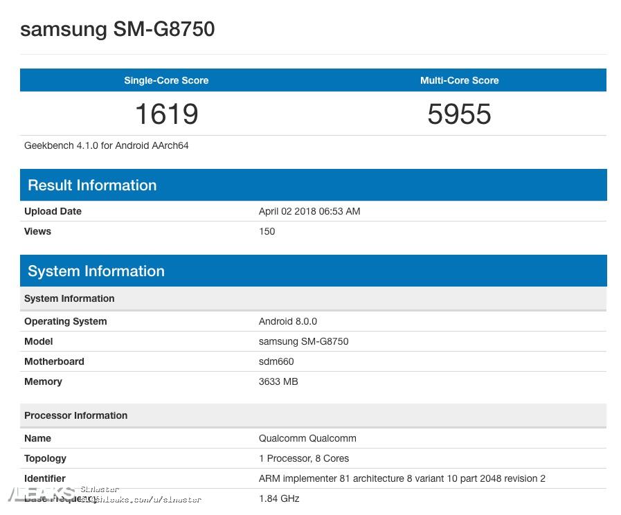 Nici Samsung Galaxy S9 nu scapă de aceste zvonuri, astfel că din China ne vin primele detalii despre Samsung SM-G8750, posibilul Samsung Galaxy S9 Mini. Acest smartphone a apărut în rapoartele testului de benchmark Geekbench, iar conform acestora aflăm că terminalul ar urma să utilizeze procesorul octa-core Qualcomm Snapdragon 660 cu Adreno 512 GPU, 4 GB RAM şi Android 8.0 Oreo din fabrică. Telefonul a obţinut un rezultat destul de bun în testul de benchmark: 1619 în Single-Core şi 5955 în Multi-Core.