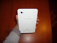Pe lateral jos sau la bază se află cele două difuzoare şi mufa pentru încărcător (metodă similară de reîncărcare şi la Dell Streak – mă refer la conector). Pe lateral sus se află mufa jack de 3,5 mm, iar pe dreapta daţi de slotul pentru cartela sim, pentru microSD ce poate acomoda până la 32 Gb, butoanele pentru reglarea volumului şi cel de pornit sau oprit poziţionat tot pe lateral şi nu superior ca la alte telefoane cu Android (comparaţia nu îşi are rostul pentru că Galaxy Tab are puţine în comun cu un simplu smartphone). Spatele este alb, plăcut. Acolo regăsiţi camera foto cu un senzor de doar 3 Megapixeli.