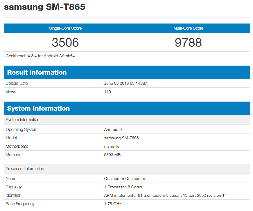 Acest model cu numele de cod SM-T865 a apărut în rapoartele testului de benchmark GeekBench, iar prin intermediul acestora aflăm primele specificaţii ale device-ului:
