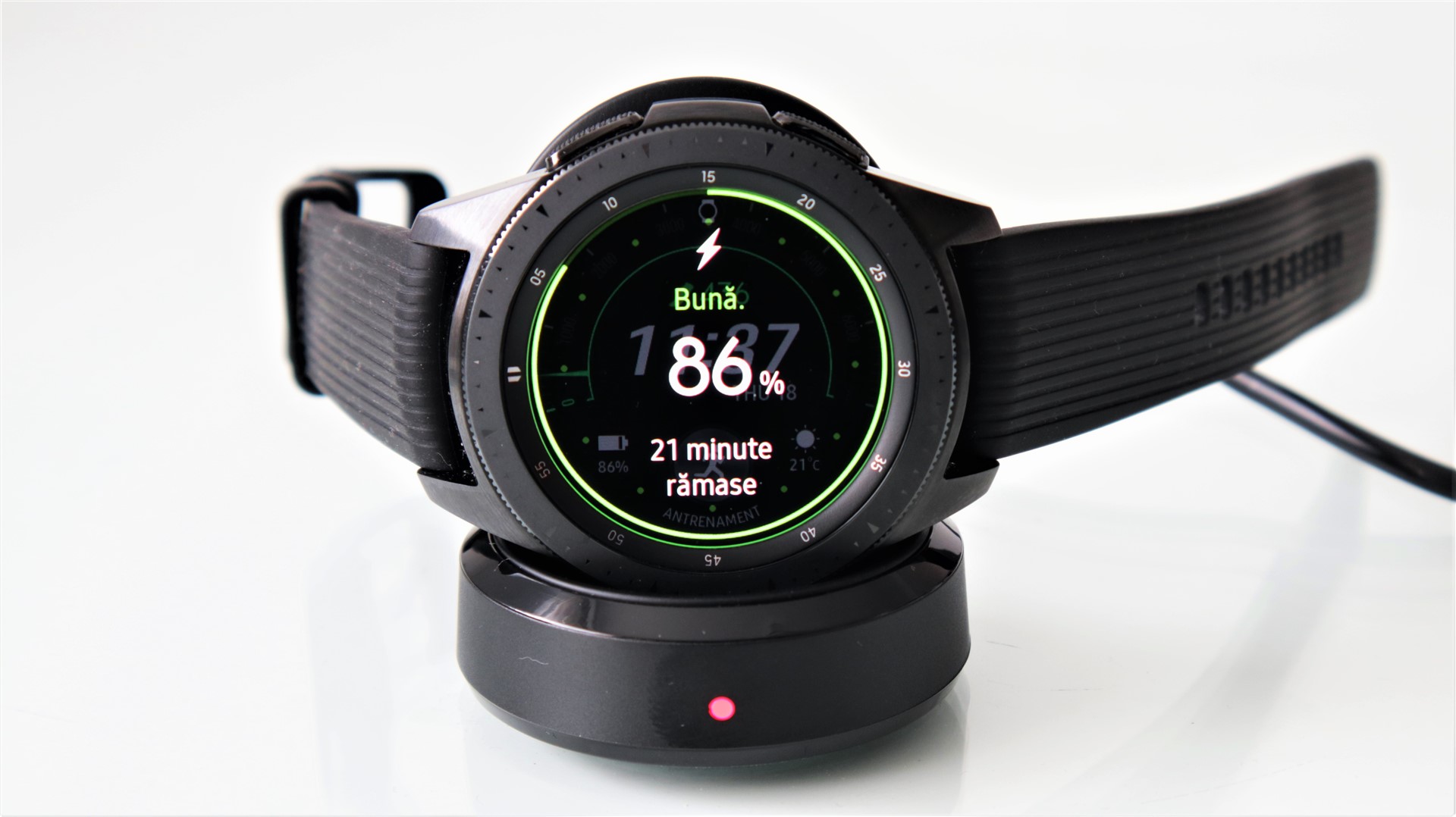 Revenind la modelul testat, Samsung Galaxy Watch de 42mm se încarcă prea încet. Adică, la o baterie de 270 mAh mă așteptam să nu dureze mai mult de 30, hai să zicem 45 de minute, pentru un full. De unde, trebuie să aștepți nu mai puțin de 2 ore și jumătate. Mult, prea mult!