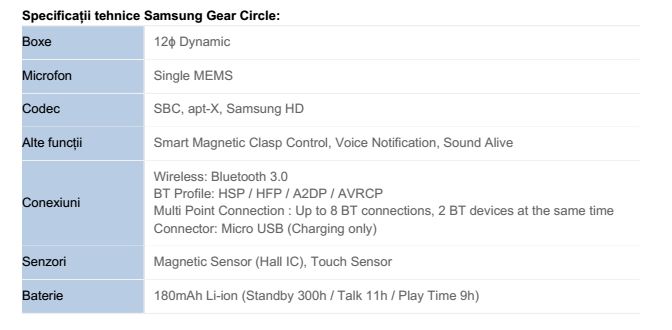 Căștile Gear Circle dispun de un motor micuț ce vibrează când sunt apeluri sau notificări pe smartphone. Pe de altă parte permit redarea de muzică, efectuarea și preluarea de apeluri, comenzi vocale. Se transformă într-un fel de lănțișor, 2 magneți permit atașarea căștilor și astfel nu se mai încurcă firul.