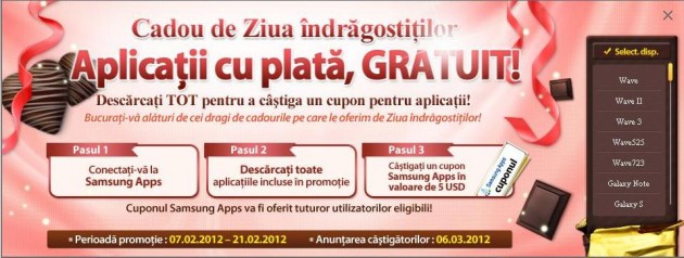 Samsung sărbătoreşte alături de clienţii fideli Ziua Îndrăgostiţilor. Până pe data de 21 februarie, majoritatea aplicaţiilor care până acum erau cu plată sunt gratuite, iar celelalte aplicaţii care rămân în continuare contra cost au reduceri semnificative de preţ.