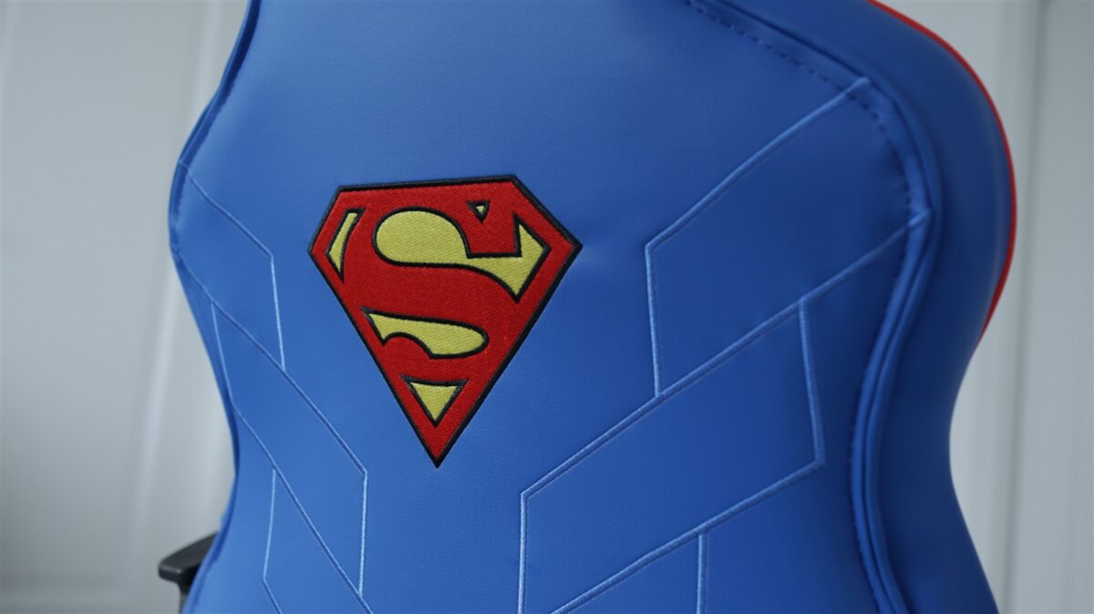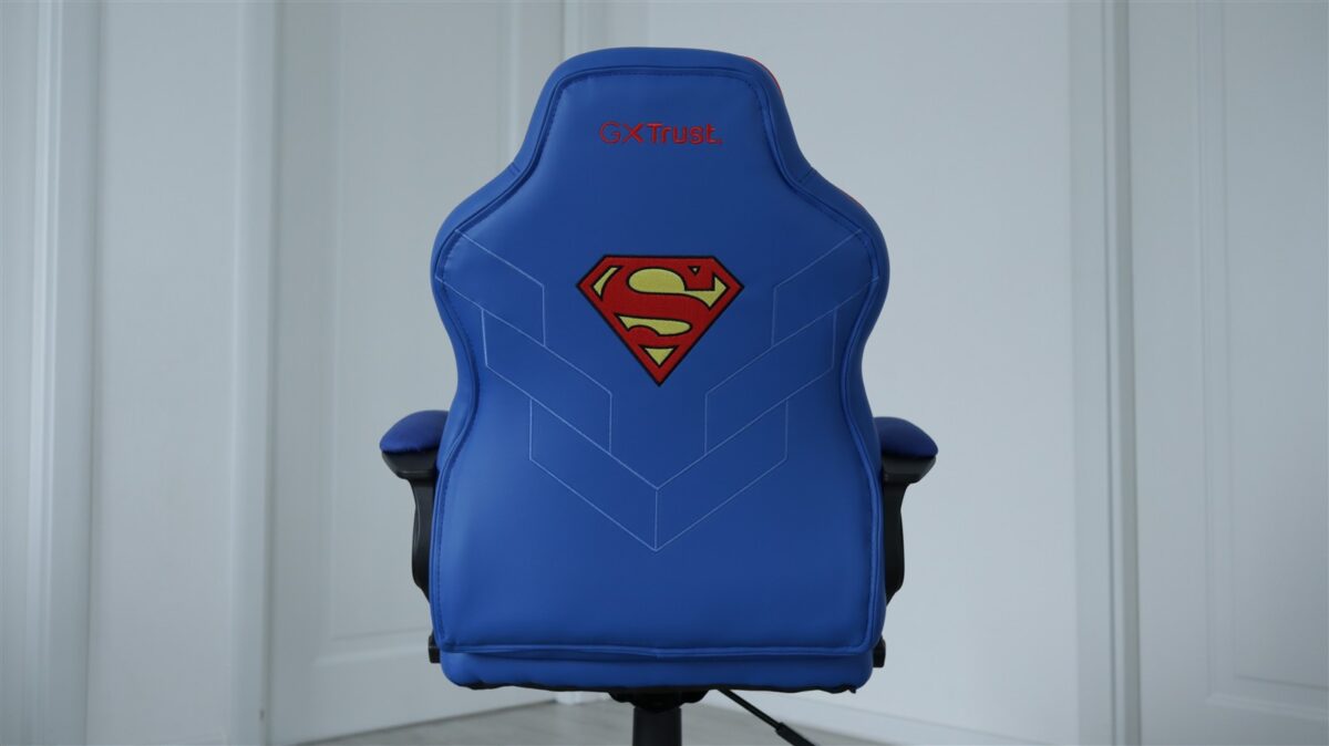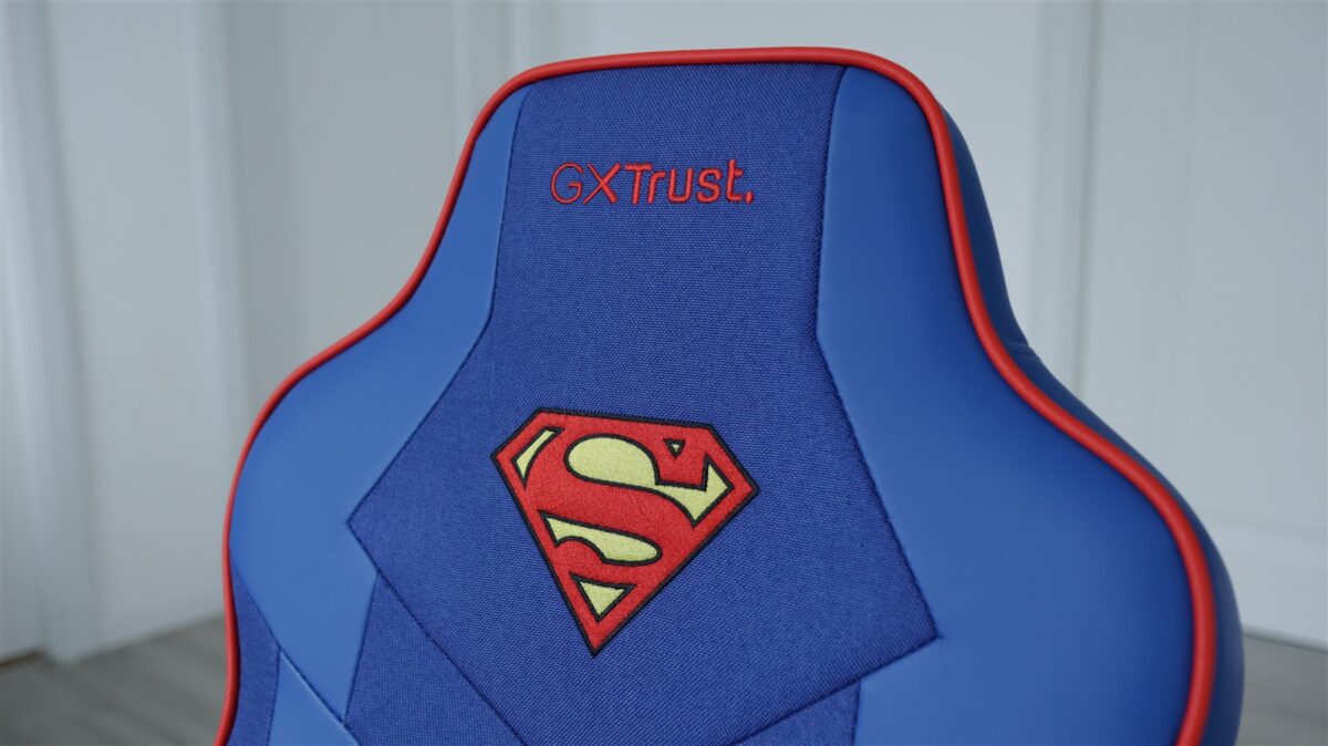 Sunt multiple elemente de design brodate atât pe partea din față a scaunului Trust Revvo Superman Edition GXT 703SM, cât și spate. Vorbim despre probabil cel mai celebru logo de supererou, acel „S” integrat într-un pentagon cu formă ca de diamant, care apare în zona de sus a spătarului pe față și ceva mai în centru pe spate. Deasupra acestui logo este de fiecare dată inscripția „GXTrust”.