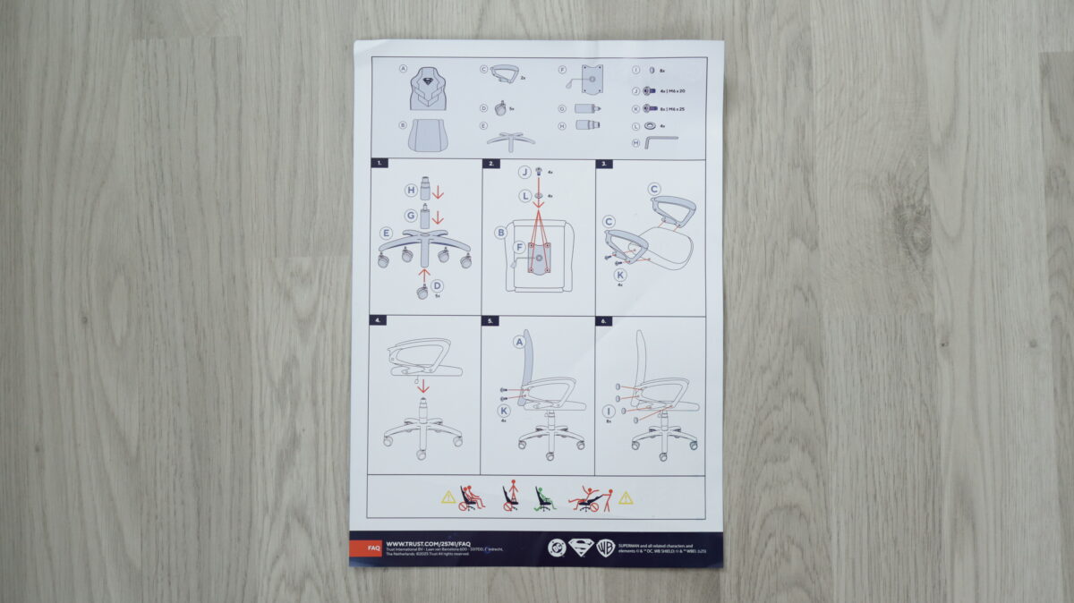 Sunt 12 șuruburi în total, pe care trebuie să le strângi cu cheia tip imbus din cutie. Primele patru (cele mai scurte) le strângi imediat și sunt cele care fixează de șezut baza cu pistonul de reglaj pe înălțime și roțile. Doar că apoi, celelalte opt necesită ceva timp, așa cum am spus, fiindcă este cam greu să le pui fix la poziție și să le strângi corect. La sfârșit, după ceva bătaie de cap, am realizat că a trecut puțin peste jumătate de oră de când am început să desfac cutia și până ce scaunul Trust Revvo Superman Edition GXT 703SM a fost gata cu totul.