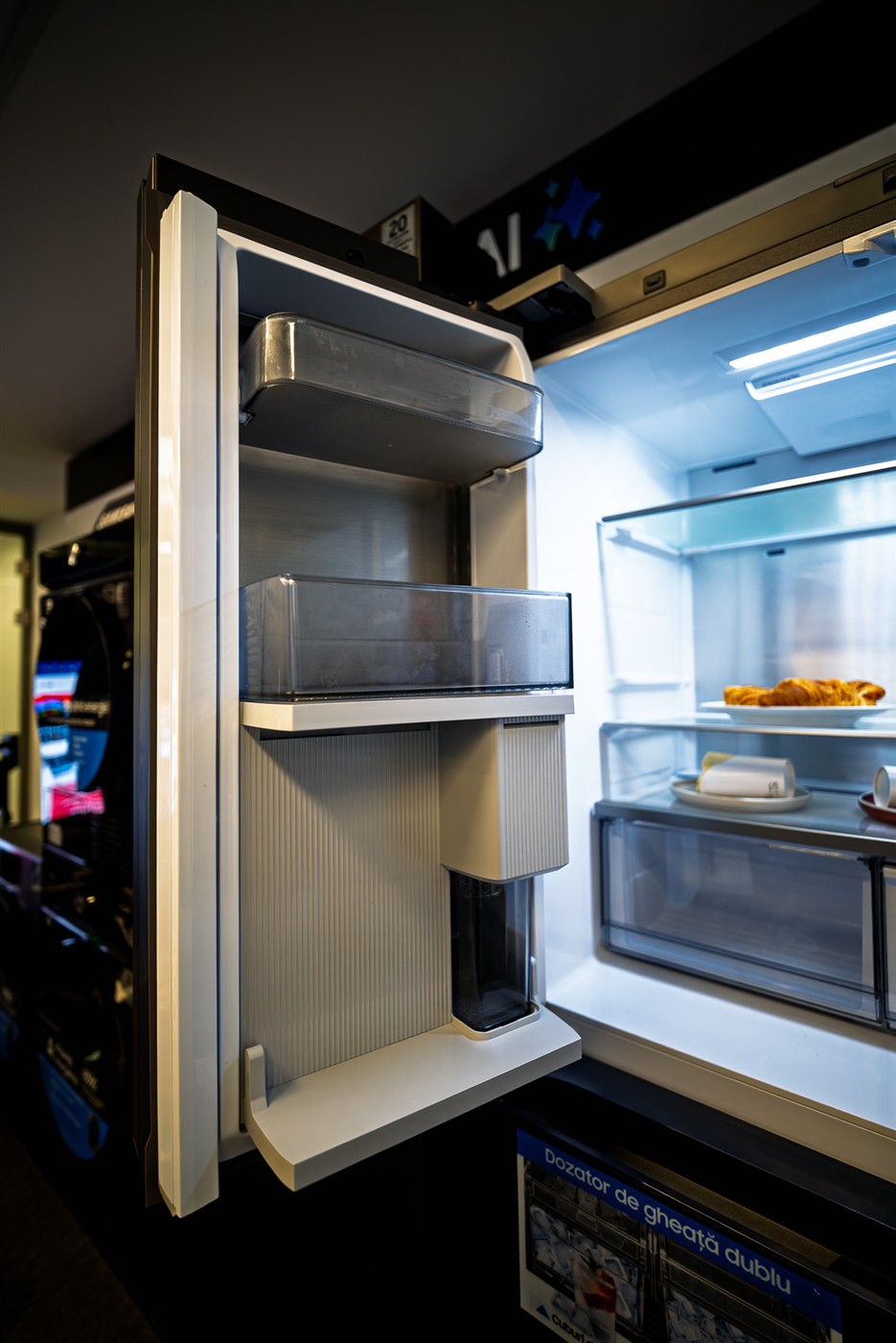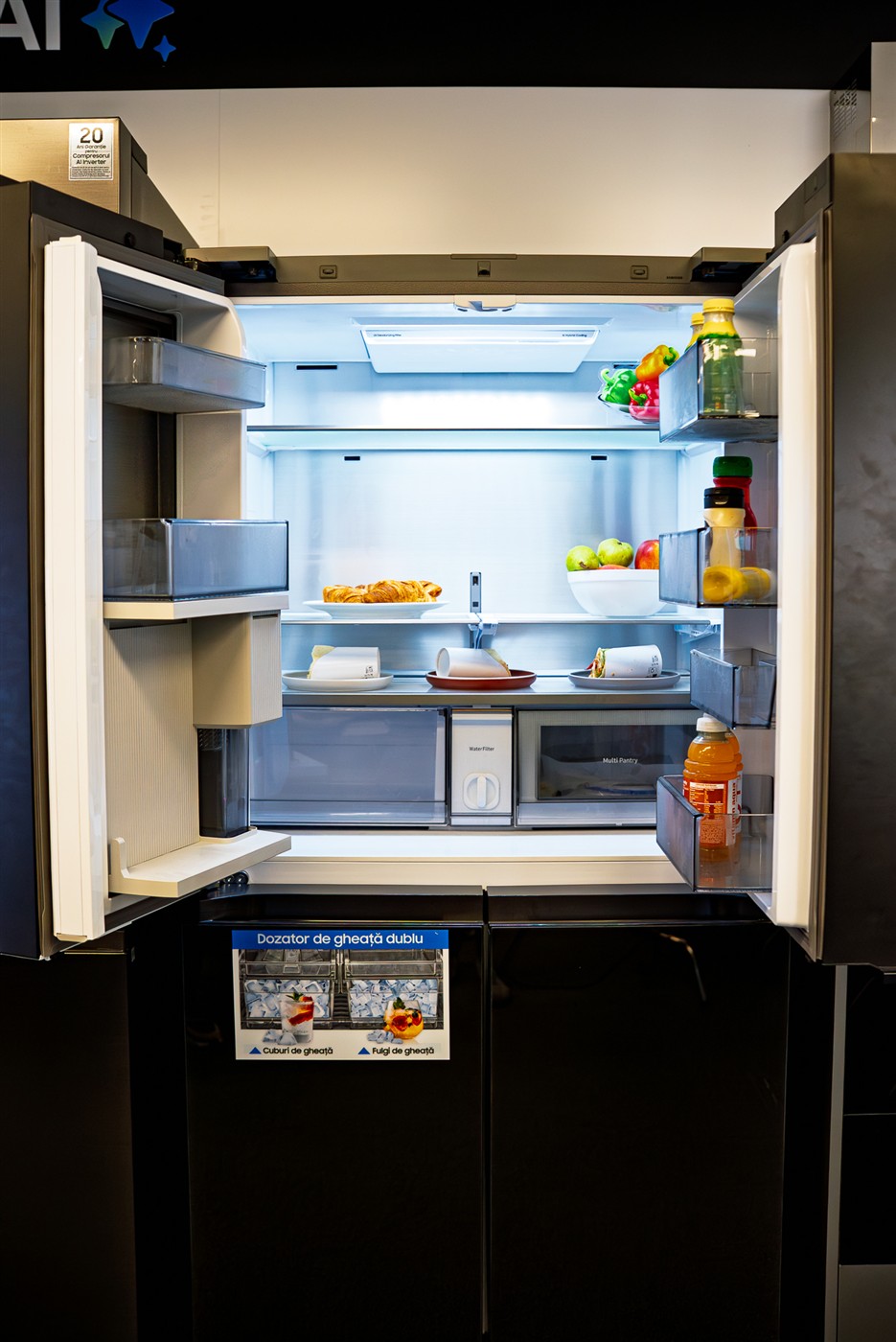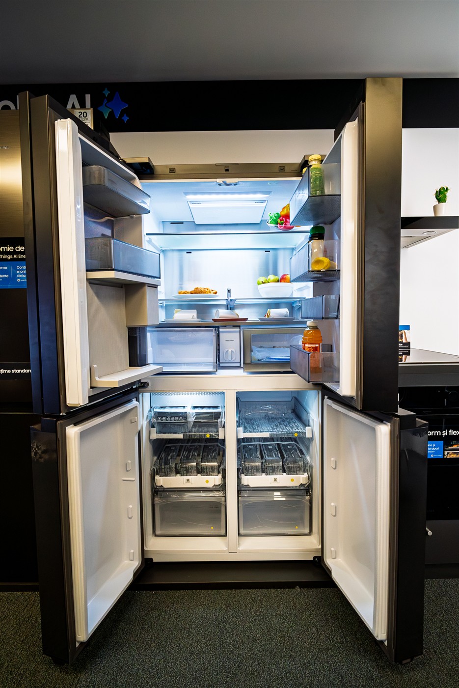 Este un frigider de tip side by side cu 4 uși. De aici și denumirea sa: French Door Bespoke AI Hybrid Cooling. Cele 4 uși fac accesul facil către produsele aflate în frigider, deschizi fix zona de care ai nevoie.