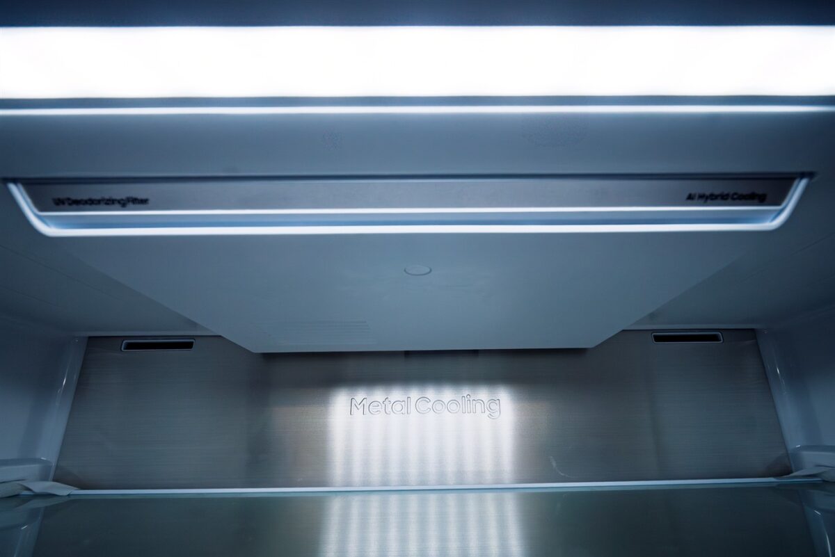 Metal Cooling se referă la placa de metal aflată pe peretele din spate, vizibilă la interior. Chiar dacă deschizi ușa frecvent, Metal Cooling reține aerul rece și ajută la o restabilire mai promptă a temperaturii. Pe de altă parte contribue și la aspectul premium al frigiderului.