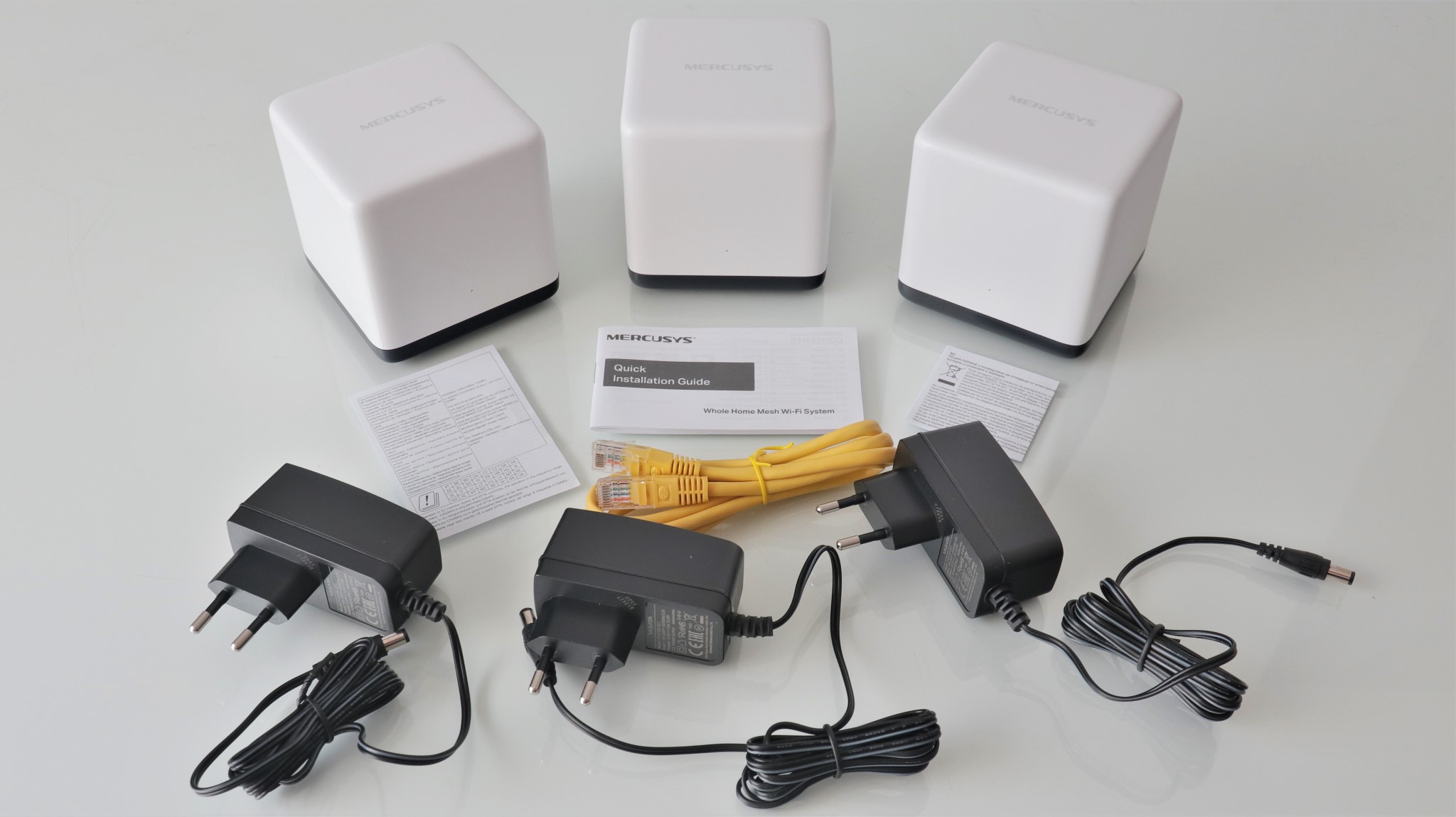 Mercusys Halo H50G poate fi ales în configurație cu doi sau cu trei sateliți. Pentru test, eu am primit pachetul cu trei noduri, în care am mai găsit și câte un adaptor de alimentare pentru fiecare, un cablu ethernet și trei pliante cu diferite informații, dintre care unul cu rol de ghid de instalare rapidă: