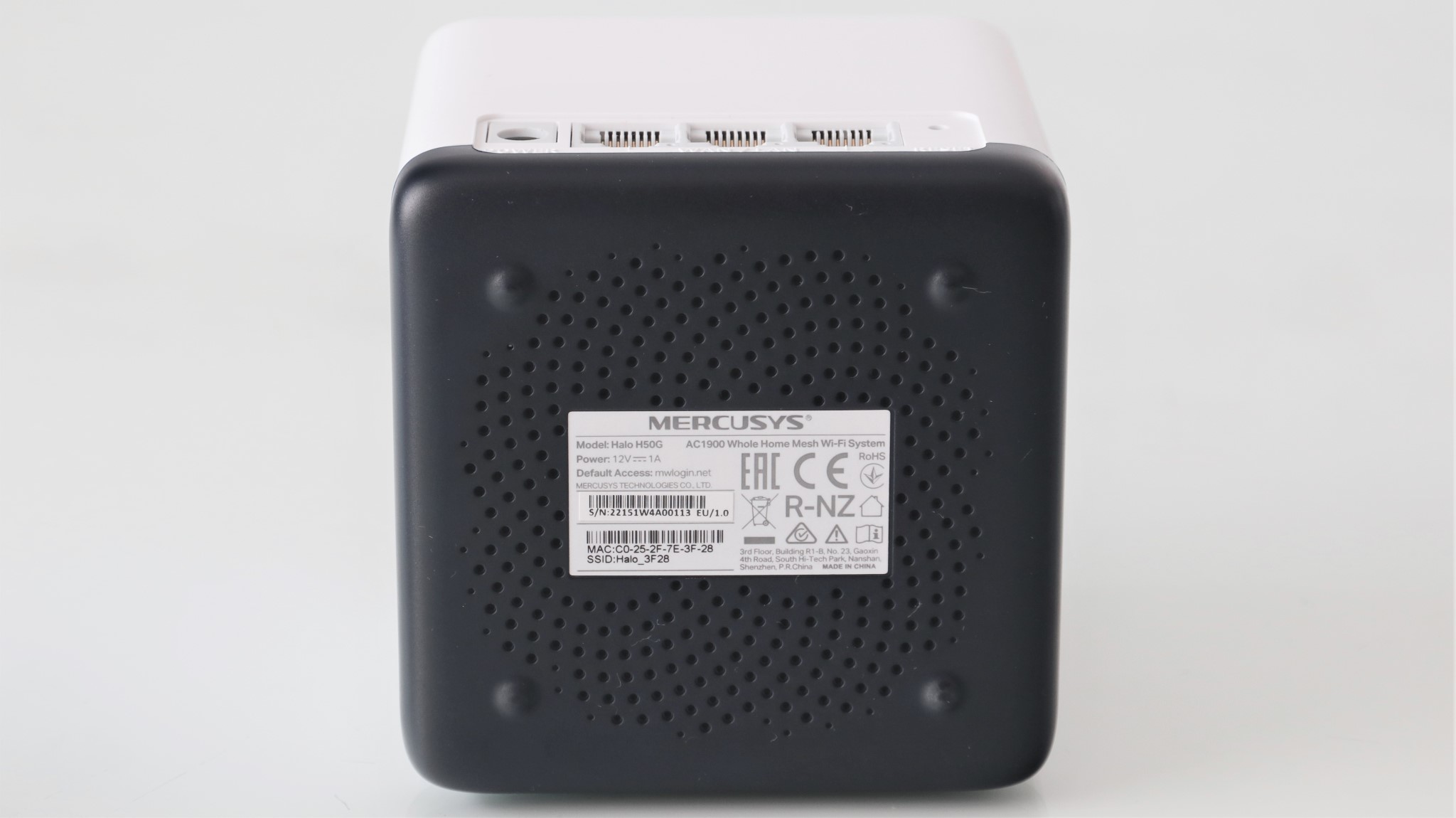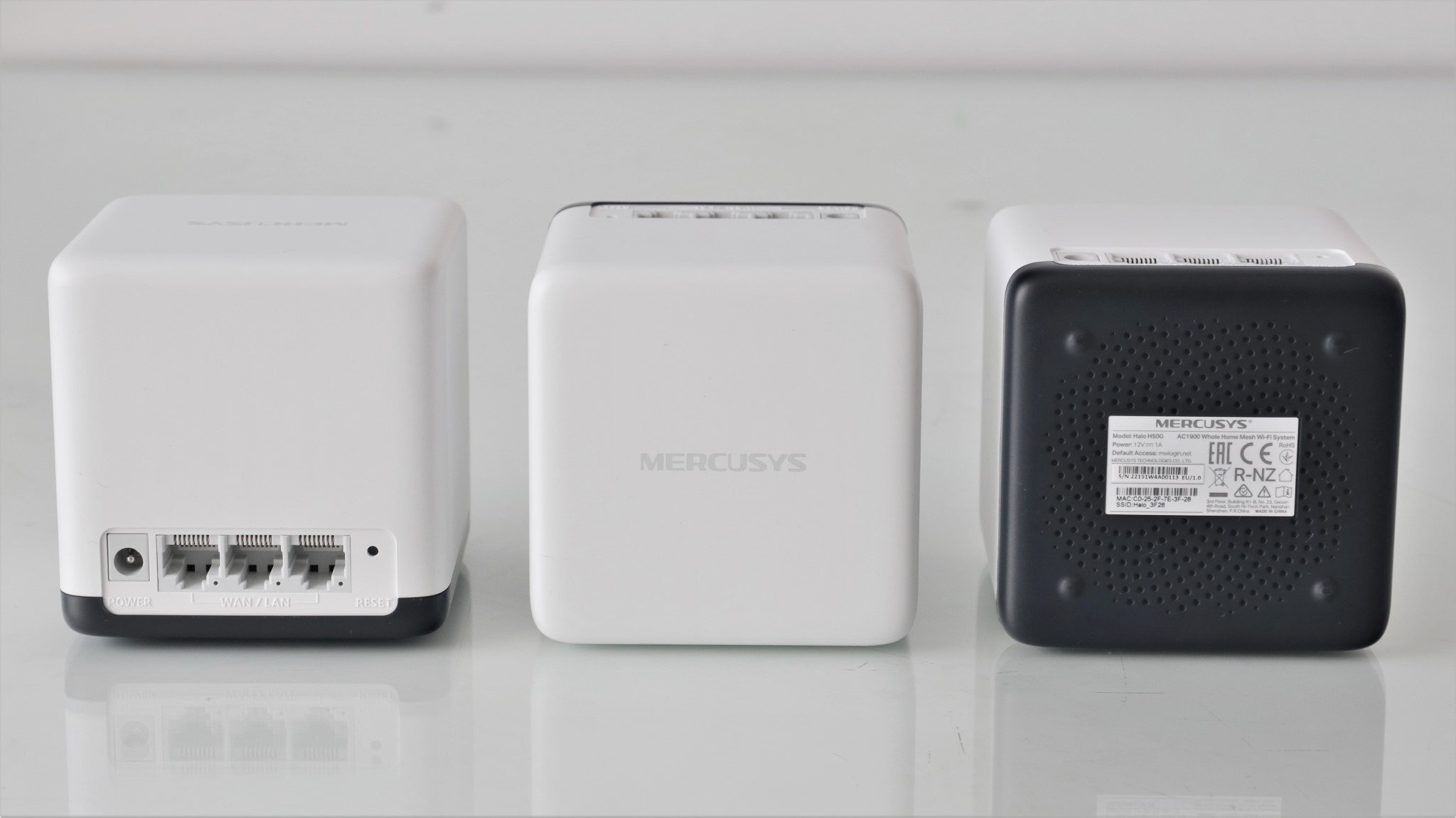 Unitățile Mercusys Halo H50G sunt extrem de asemănătoare cu cele ale modelului Mercusys Halo S12. Față de cele parte a sistemului testat în urmă cu mai bine de un an, avem o altă  culoare pentru baza nodurilor, a dispărut butonul Pair și avem o greutate ceva mai ridicată pentru fiecare satelit.