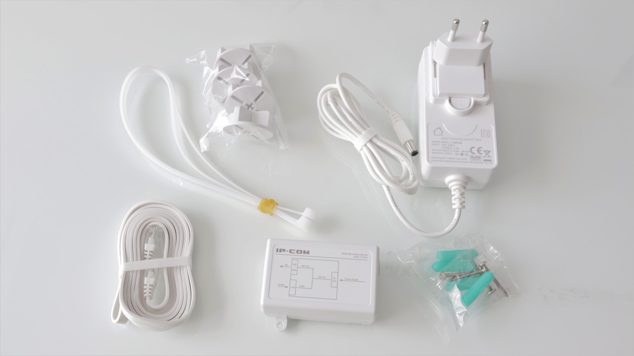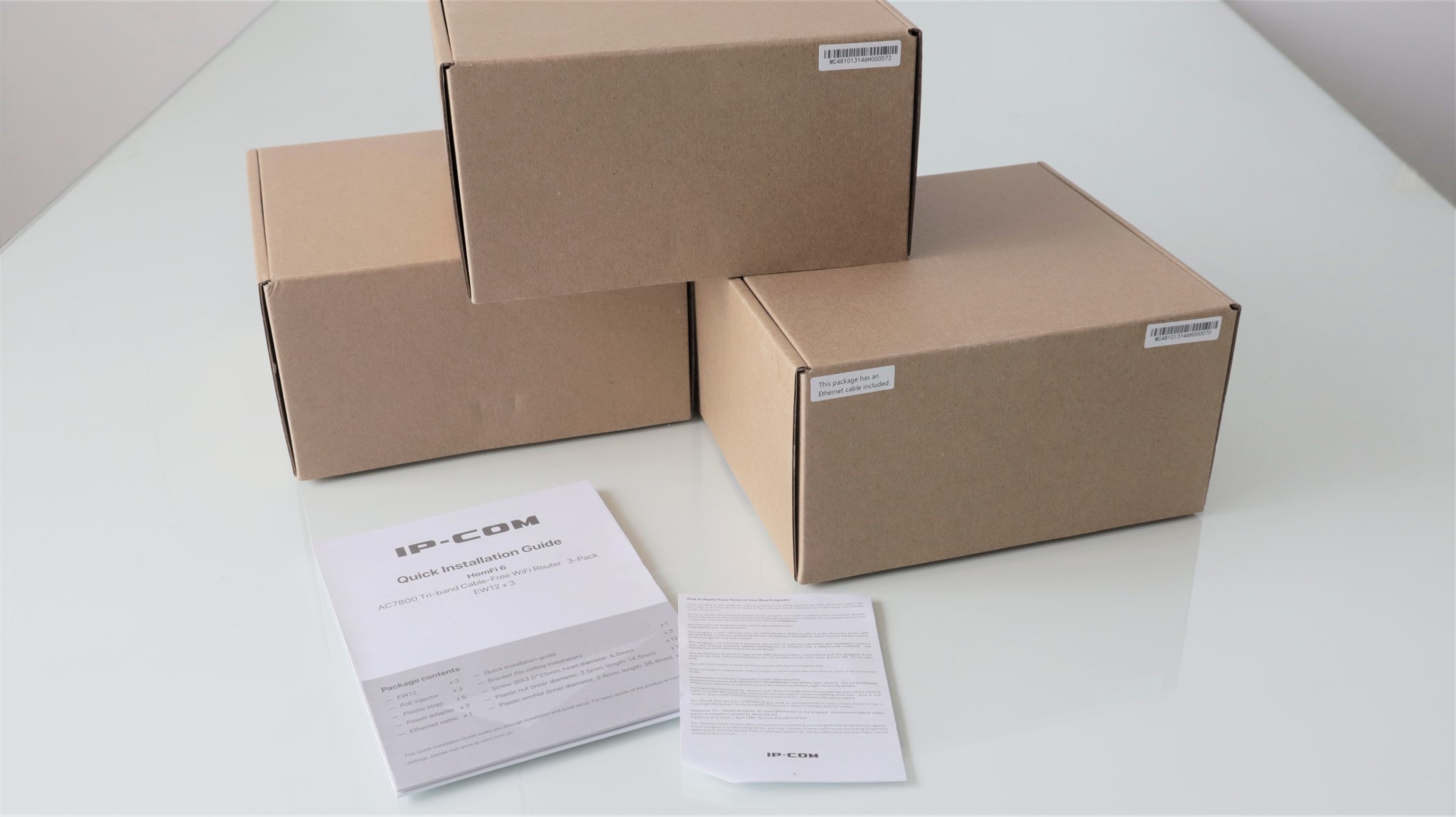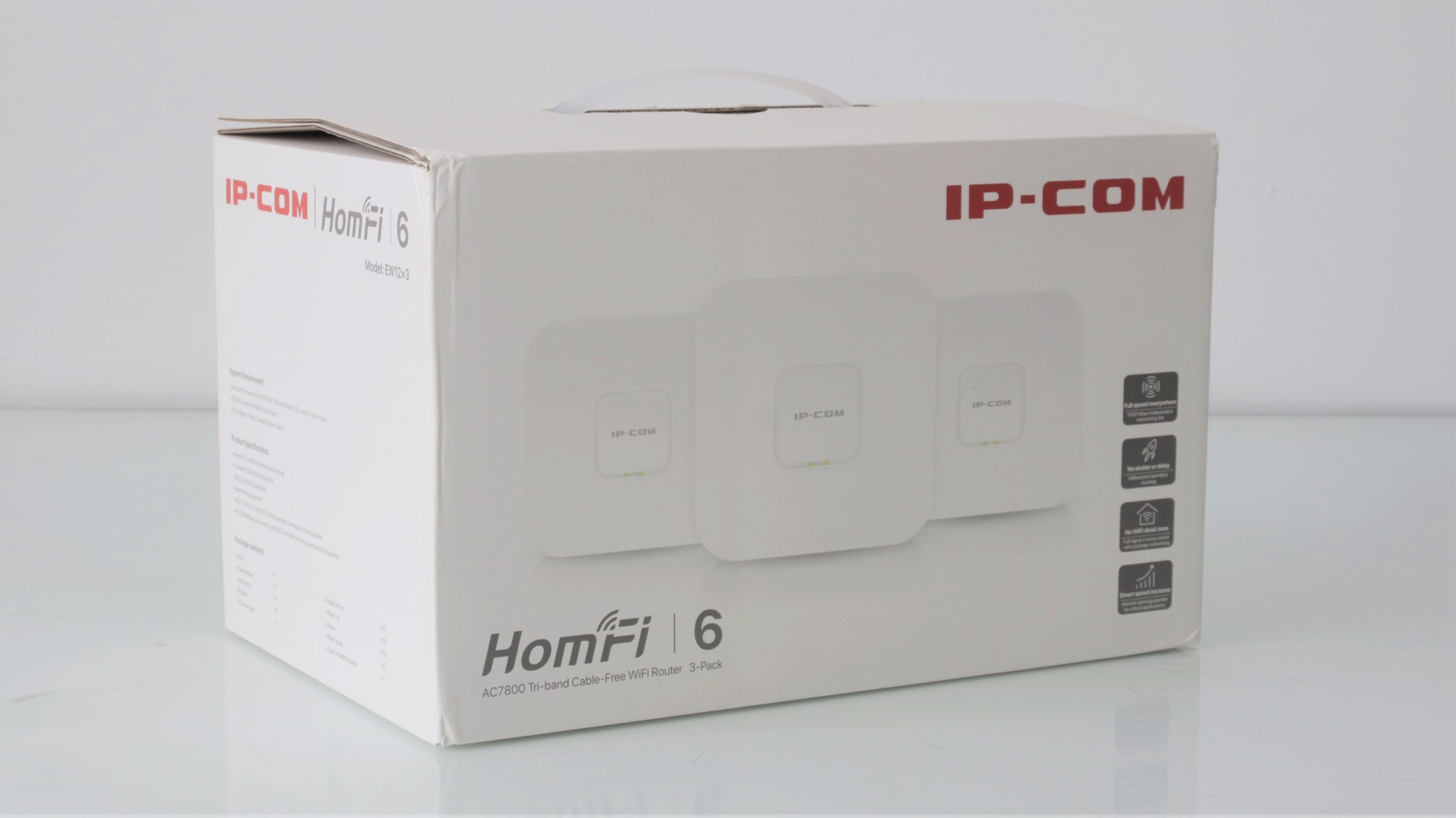 Cutia sistemului IP-COM HomeFi 6 conține alte trei cutii, câte una separată pentru fiecare unitate EW12. Pe lângă un ghid de pornire rapidă și un alt pliant cu informații diverse din cutia mare, fiecare dintre cele 3 cutii mai mici conținea un nod EW12, cu suport de montaj pe perete / tavan gata fixat, adaptor de alimentare, modul de alimentare PoE, 4 dibluri cu șuruburi pentru fiecare, 4 adaptoare de prindere în tavan fals / gipscarton și două bride pentru managementul cablurilor. De asemenea, una dintre cele 3 cutii conținea și un cablu Ethernet cu fir plat: