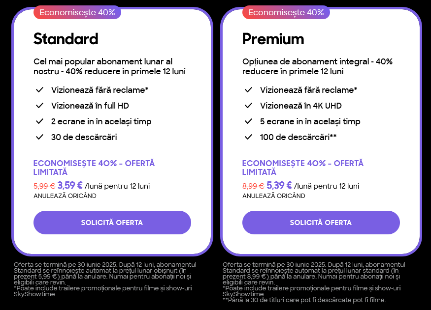 - SkyShowtime Standard – 3.59 euro / lună timp de 12 luni;