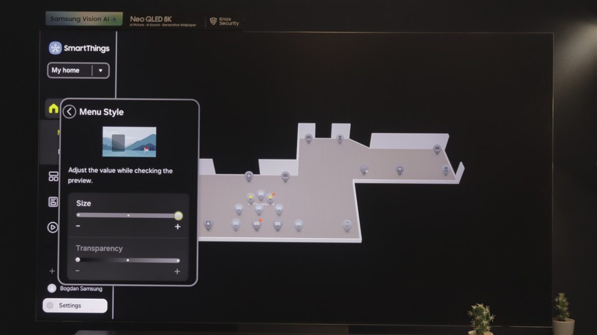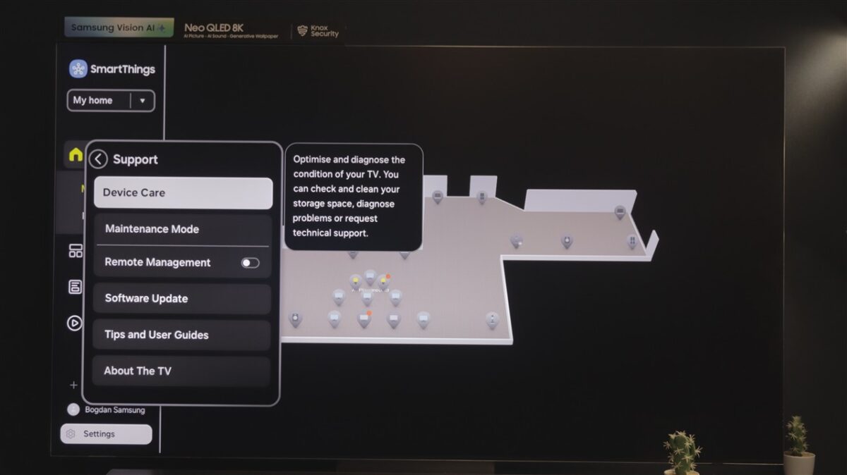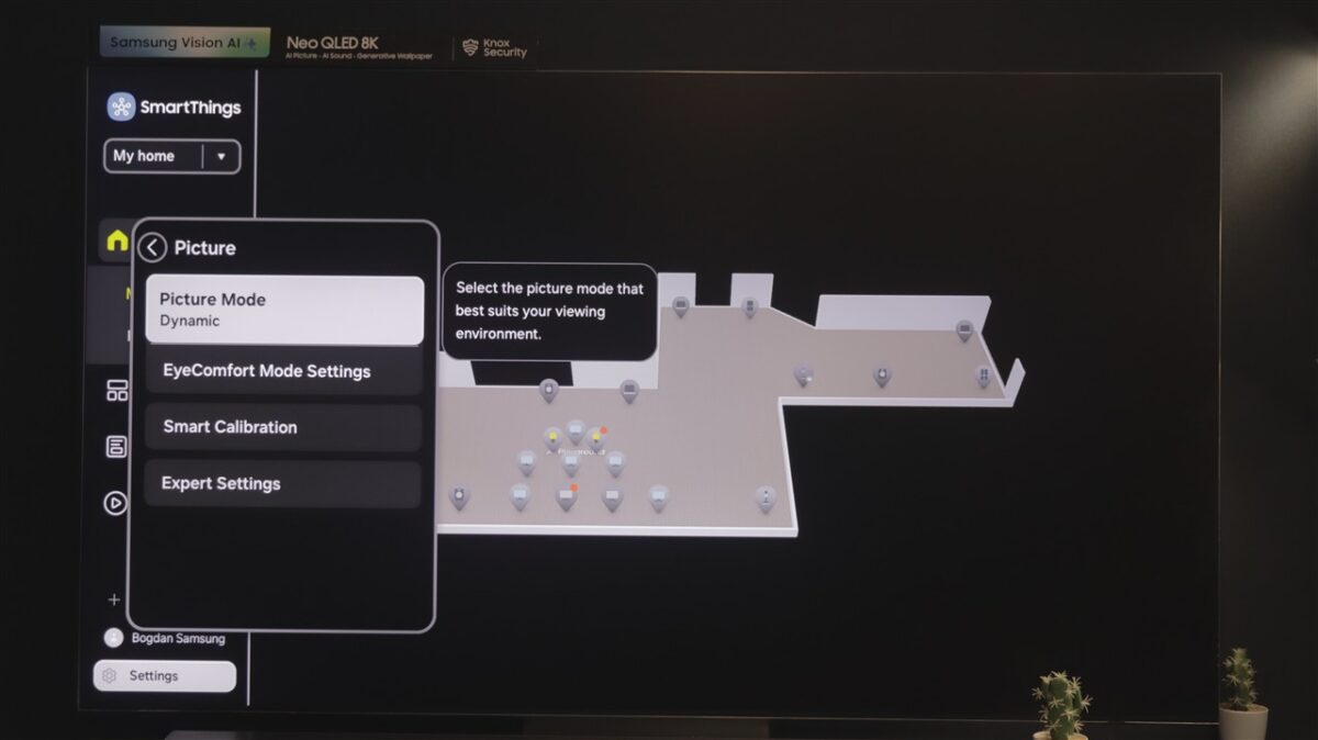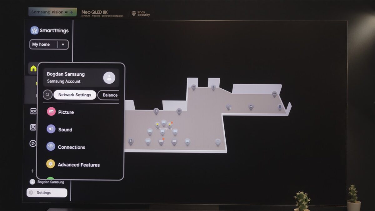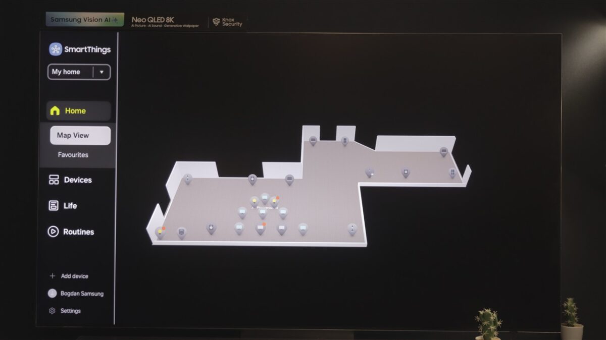 Ce mi-a atras atenția la Tizen OS este spațiul dedicat SmartThings. Practic, televizorul devine un hub de control al tuturor dispozitivelor compatibile SmartThings, care pot fi afișate direct pe ecranul televizorului, pe care poți întocmi chiar o hartă a locuinței, cu poziția fiecărui dispozitiv fix (frigider, mașină de spălat rufe sau vase, cuptor etc).