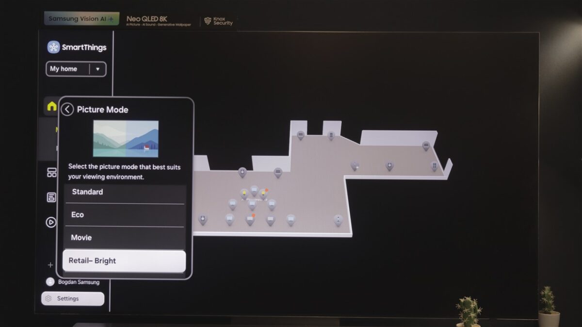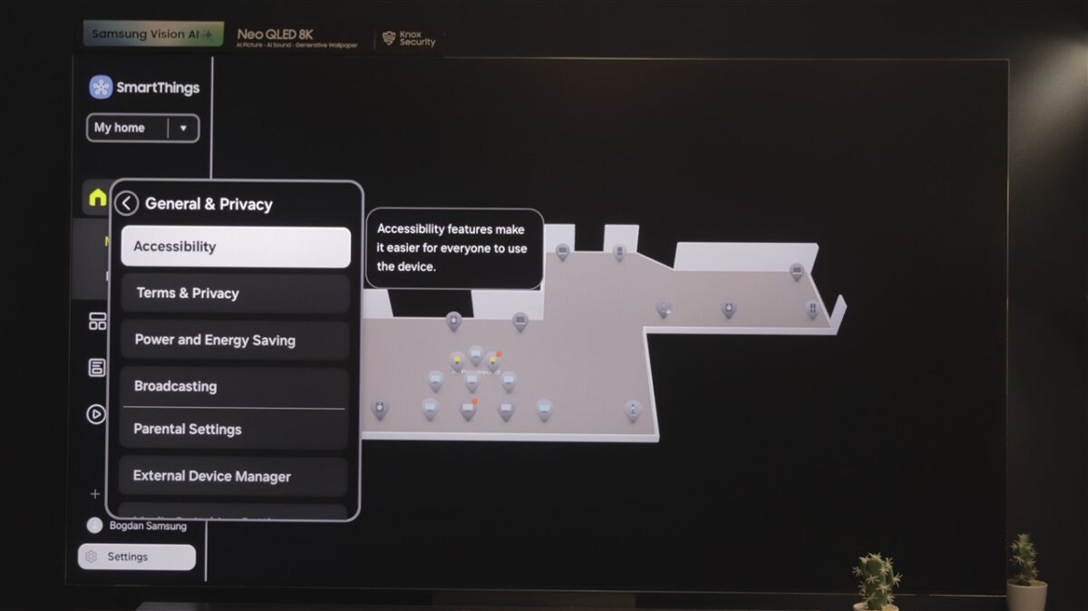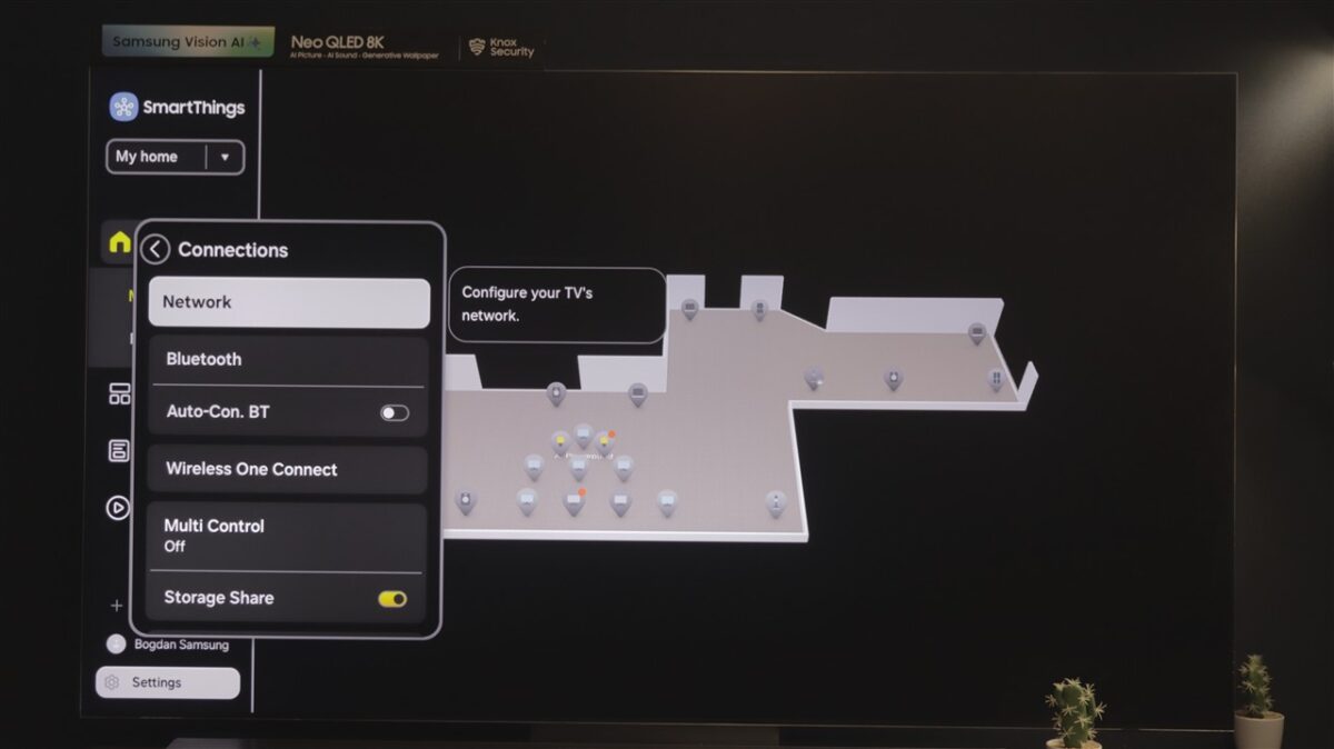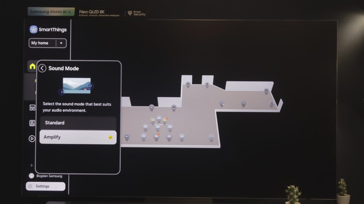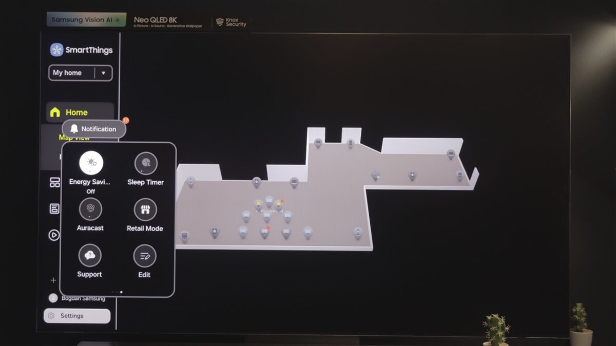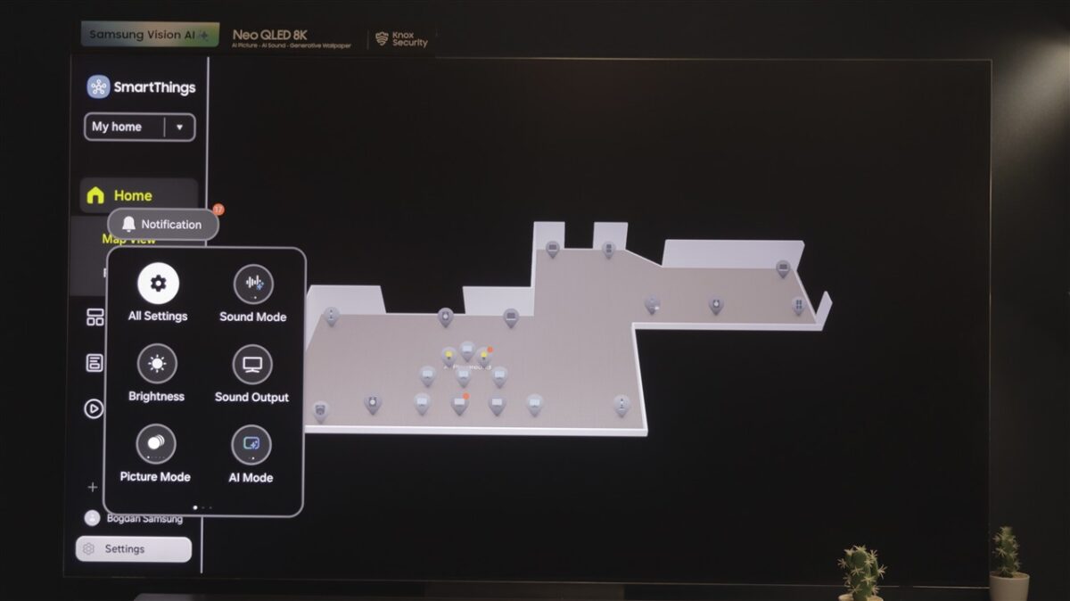 Ce mi-a atras atenția la Tizen OS este spațiul dedicat SmartThings. Practic, televizorul devine un hub de control al tuturor dispozitivelor compatibile SmartThings, care pot fi afișate direct pe ecranul televizorului, pe care poți întocmi chiar o hartă a locuinței, cu poziția fiecărui dispozitiv fix (frigider, mașină de spălat rufe sau vase, cuptor etc).