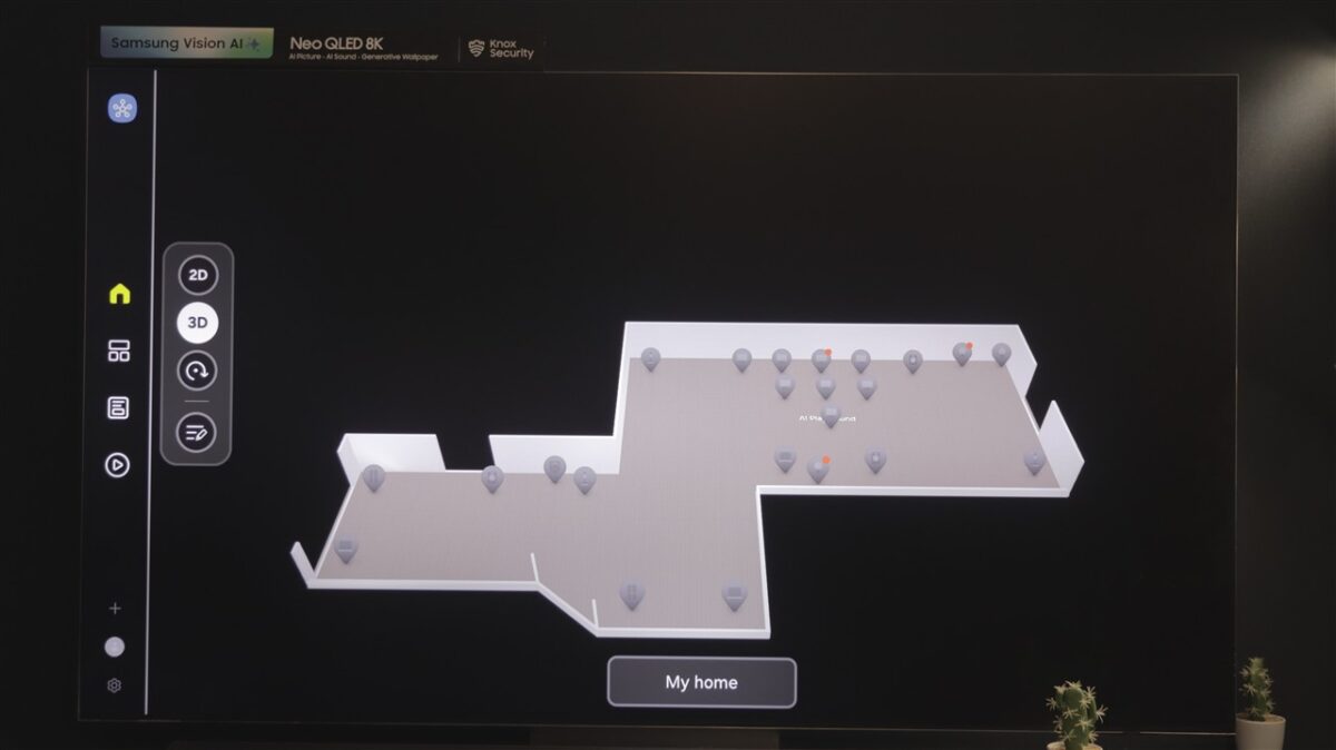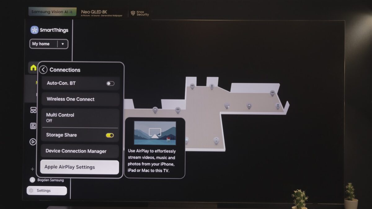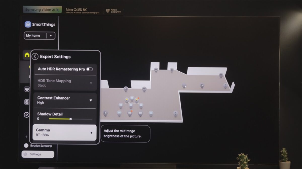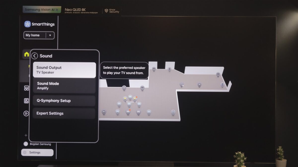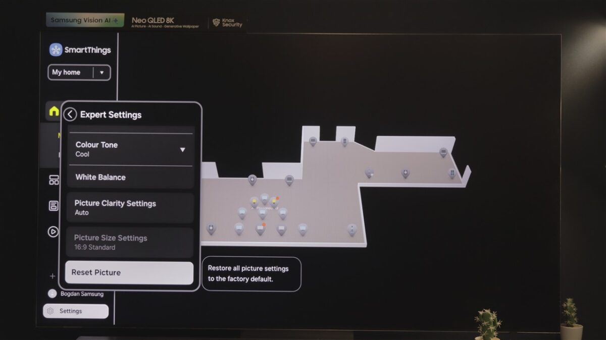Ce mi-a atras atenția la Tizen OS este spațiul dedicat SmartThings. Practic, televizorul devine un hub de control al tuturor dispozitivelor compatibile SmartThings, care pot fi afișate direct pe ecranul televizorului, pe care poți întocmi chiar o hartă a locuinței, cu poziția fiecărui dispozitiv fix (frigider, mașină de spălat rufe sau vase, cuptor etc).