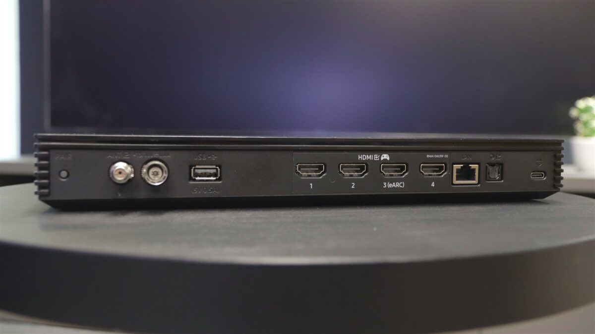 Modulul One Connect Box de față dispune de 3 porturi USB-A (2 pe laterala din dreapta + 1 pe spate), 4 porturi HDMI 2.1 cu suport pentru rezoluții și rate înalte de refresh (puse în tabelul cu specificații), 2 x intrare RF (cablu / antena / satelit), un port Ethernet, o ieșire digitală audio și un port USB-C (doar pentru alimentarea modulului).