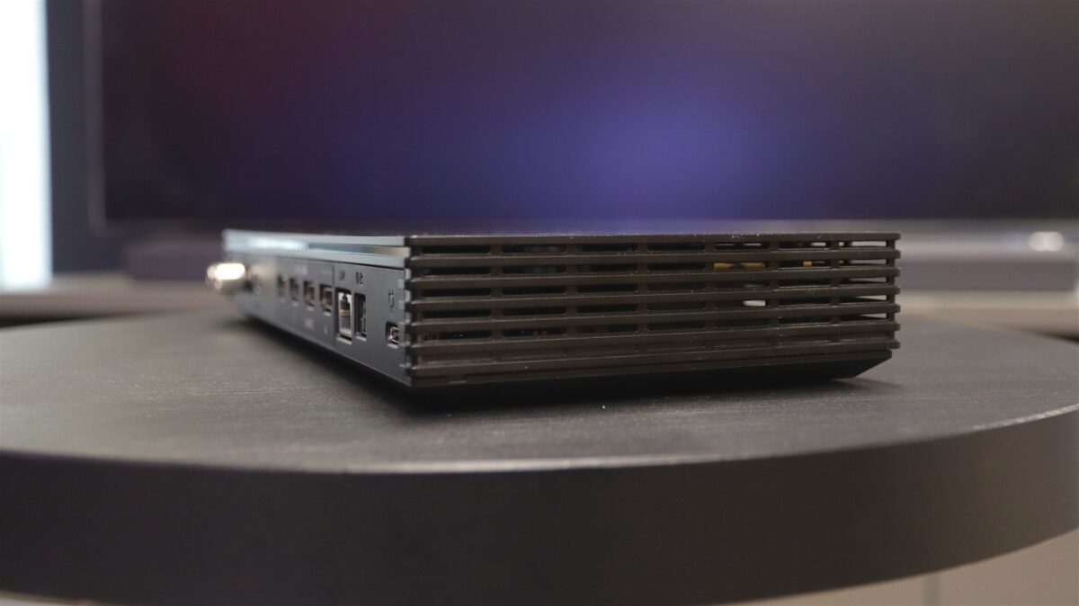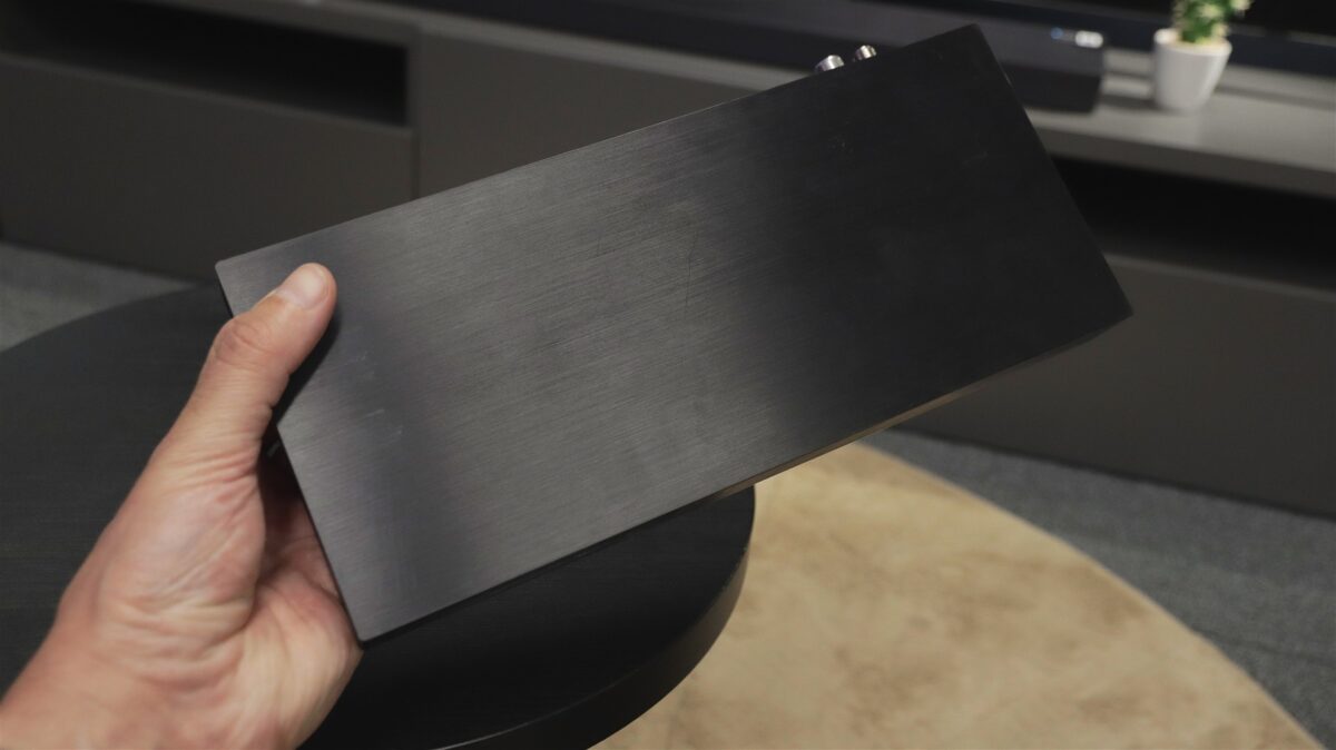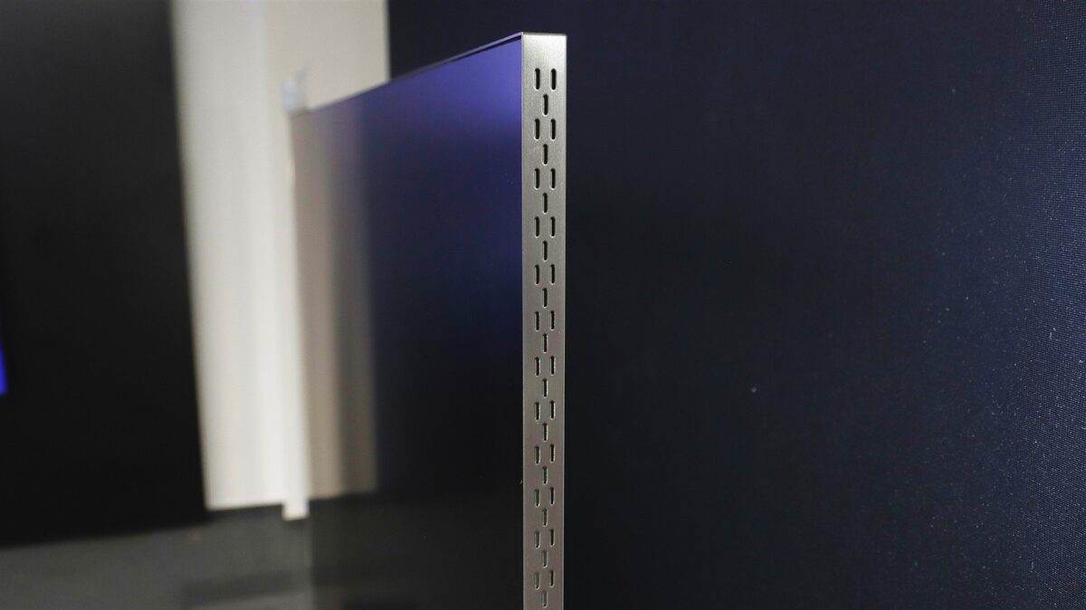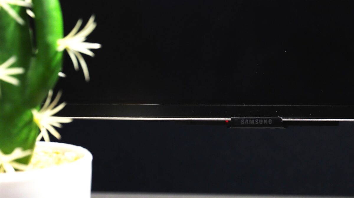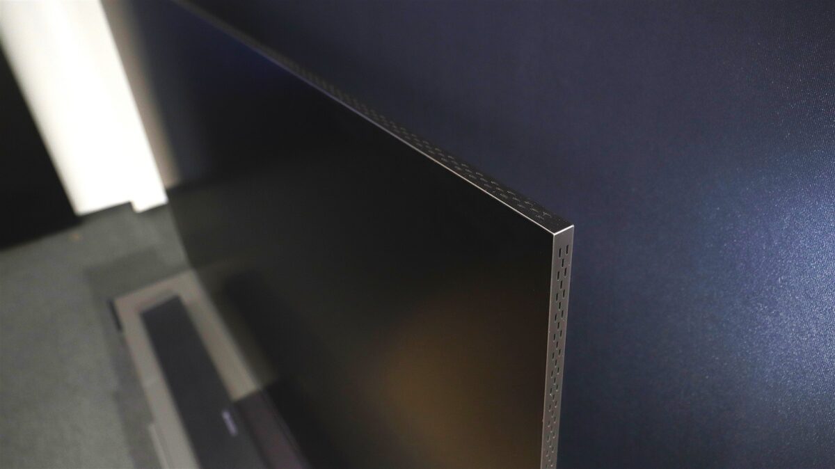 Marginea metalică care înconjoară trei laturi (sus și laterale) are multiple orificii care au rol atât estetic, fiind plăcute privirii, cât și funcțional, lăsând aerul cald din interior să iasă mai rapid de sub carcasă. Cum a fost posibil pentru Samsung să obțină o grosime atât de redusă pentru un televizor vârf de gamă, plin de tehnologie? Cel mai probabil faptul că tot ce ține de conectivitate a fost „exportat” către un modul extern, deja celebrul One Connect Box, care în cazul de față este și el mai compact decât te-ai putea aștepta. Mai multe despre One Connect Box la capitolul Conectivitate.