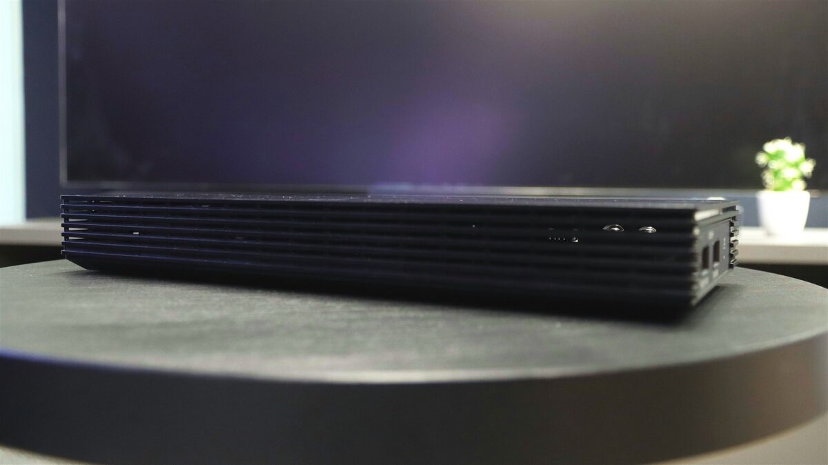 Aici regăsim ceva ce mi-ar plăcea să văd tot mai mult implementat pe orice fel de televizor, anume un modul extern de conectivitate, în care să poți introduce toate cablurile necesare, modul care mai apoi să „comunice” cu televizorul în mod strict wireless. Fix așa se întâmplă în cazul Samsung 75QN990F, al cărui One Connect Box slim este genial. Pe cât de compact și de ușor este, pe atât de capabil. Îți pune la dispoziție toate porturile de care ai putea avea nevoie (nu am găsit slot CI+, dar cred că modelele de retail au și așa ceva, pe site-ul oficial Samsung așa stă scris, deci, cel mai probabil lipsa slotului se datorează faptului că avem de-a face cu un exemplar de preproducție).