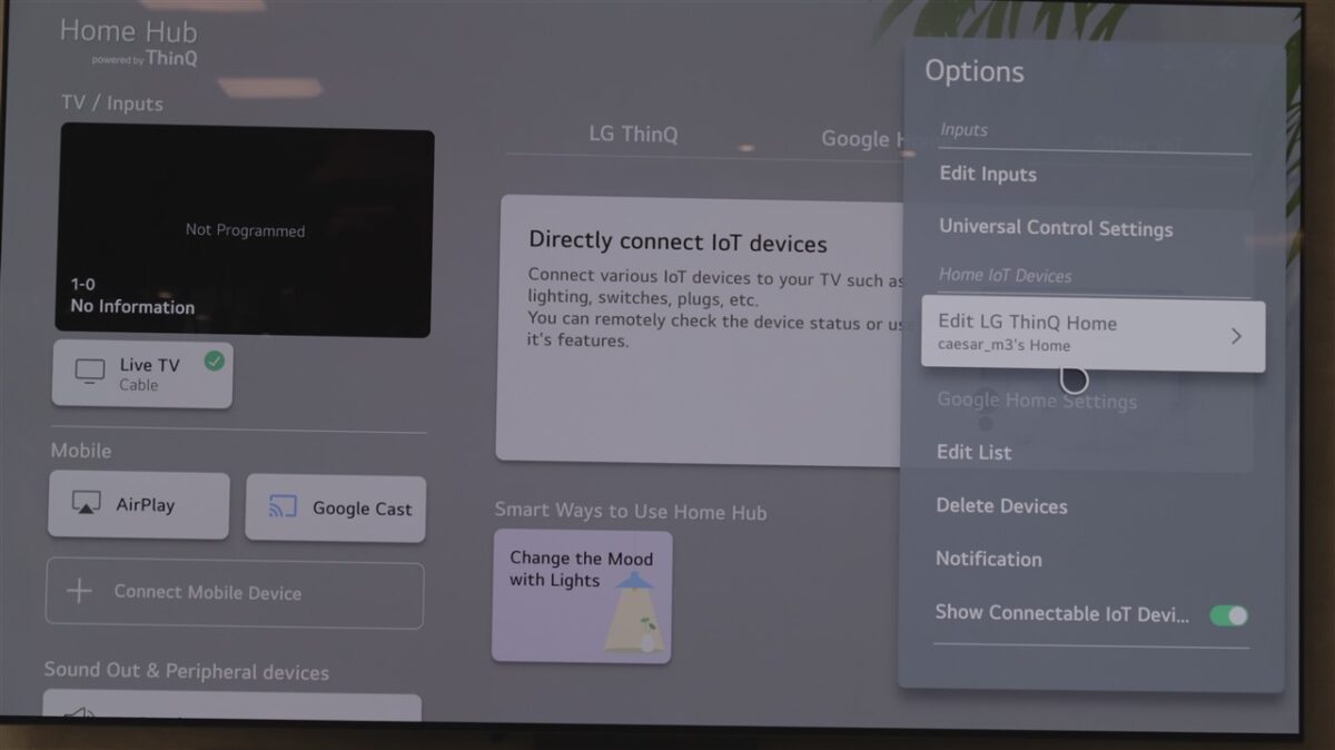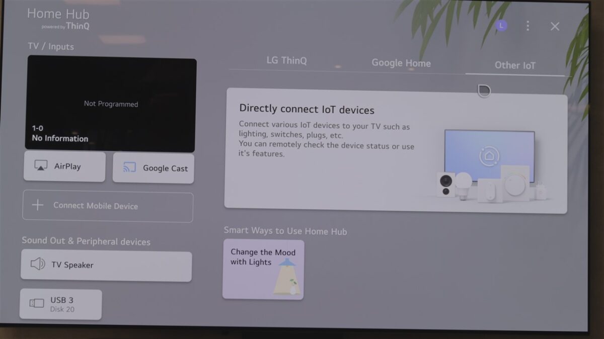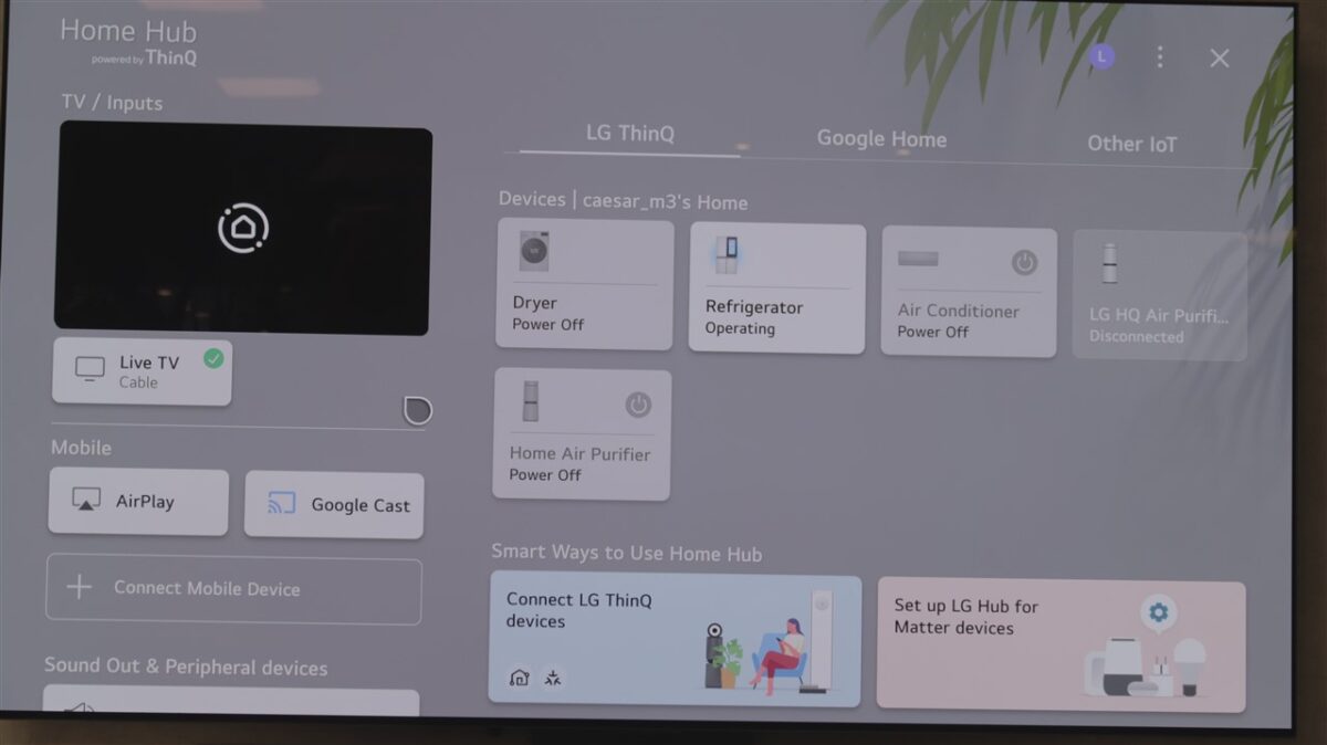 Avem mai nou o zonă separată, numită Home Hub, unde poți găsi toate electronicele și electrocasnicele ce pot fi integrate în ecosistemul LG. Și, din fericire, nu doar cele LG sunt compatibile, ci sunt destule de la alți producători care pot fi aduse aici. În funcție de fiecare vei avea mai multe sau mai puține opțiuni de control. Tot în Home Hub găsești și zonele Apple AirPlay și Google Cast.