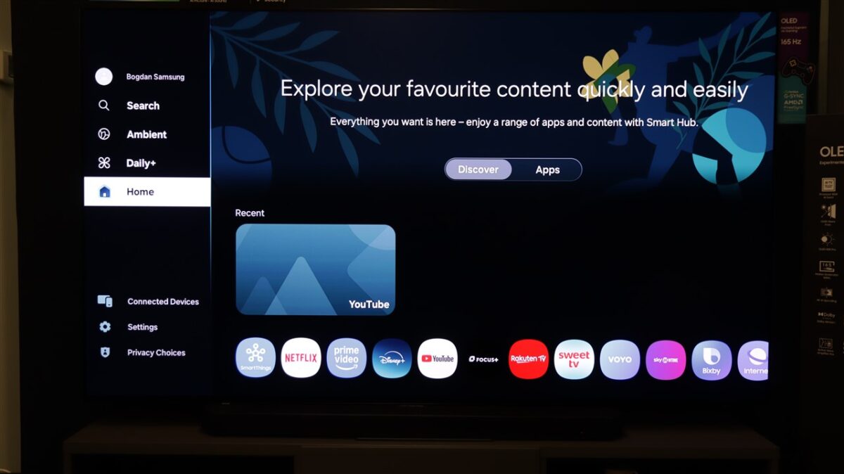 Fără a avea prea multe detalii despre ce ansamblu hardware se află sub carcasa Samsung Vision AI OLED 77S95F (de fapt mai nimic nu știm…), putem trece la analiza sistemului de operare Tizen OS. Acesta este așa cum îl cunoaștem de ani buni la Samsung, interfața a primit cu fiecare nouă ediție doar mici ajustări, ecranul Home s-a transformat într-unul tot mai aerisit, cu mai puține elemente prezente acolo. Îl poți personaliza destul de mult, poți aduce aplicațiile favorite pe pozițiile fruntașe, dar probabil cel mai mult contează că mai toate aplicațiile de care ai nevoie sunt disponibile în magazinul Samsung și că interfața rulează mai mereu fluid, fără întârzieri majore. Mai apare ceva lag sau agățări, dar nu ceva deranjant sau care să strice experiența de utilizare.